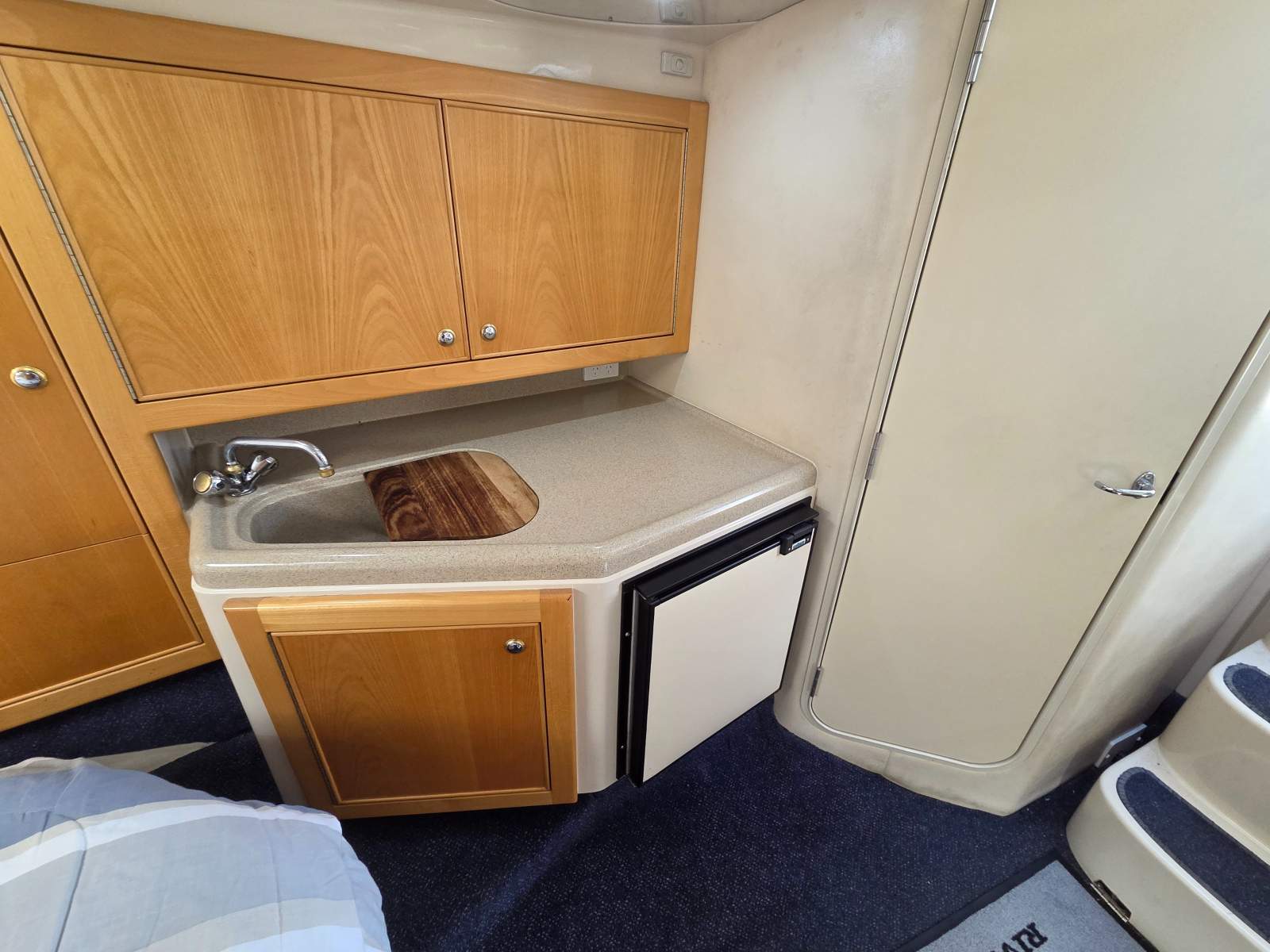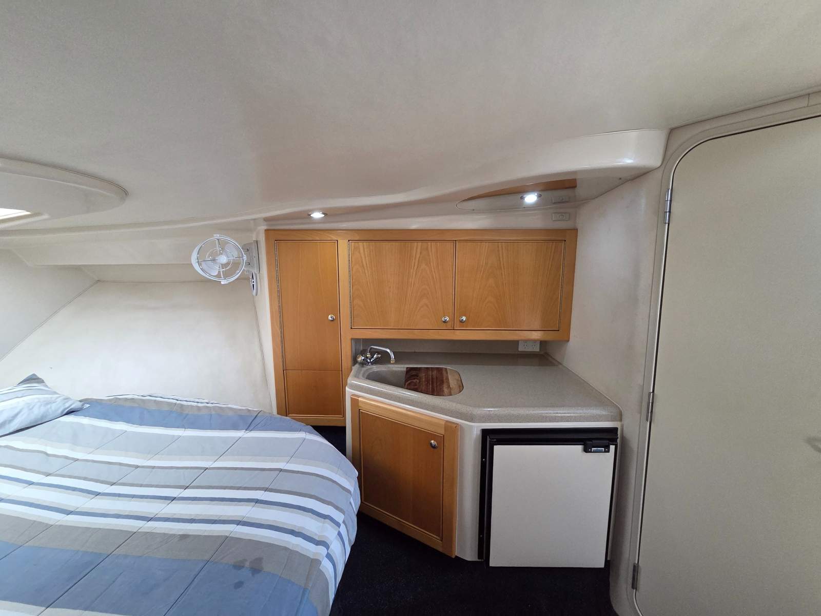 At the helm, a comfortable designer seat side faces a a sporty steering wheel, full engine controls and instrumentation that has been upgraded with modern Garmin touch screen capability. The helm deck area provides plenty of seating for guests around a dinette table on the port side and a wet bar immediately behind the helm seat includes a sink with mixer tap, drainer, under-bench fridge and storage. A portable stainless barbecue is thoughtfully tucked away with easy access.