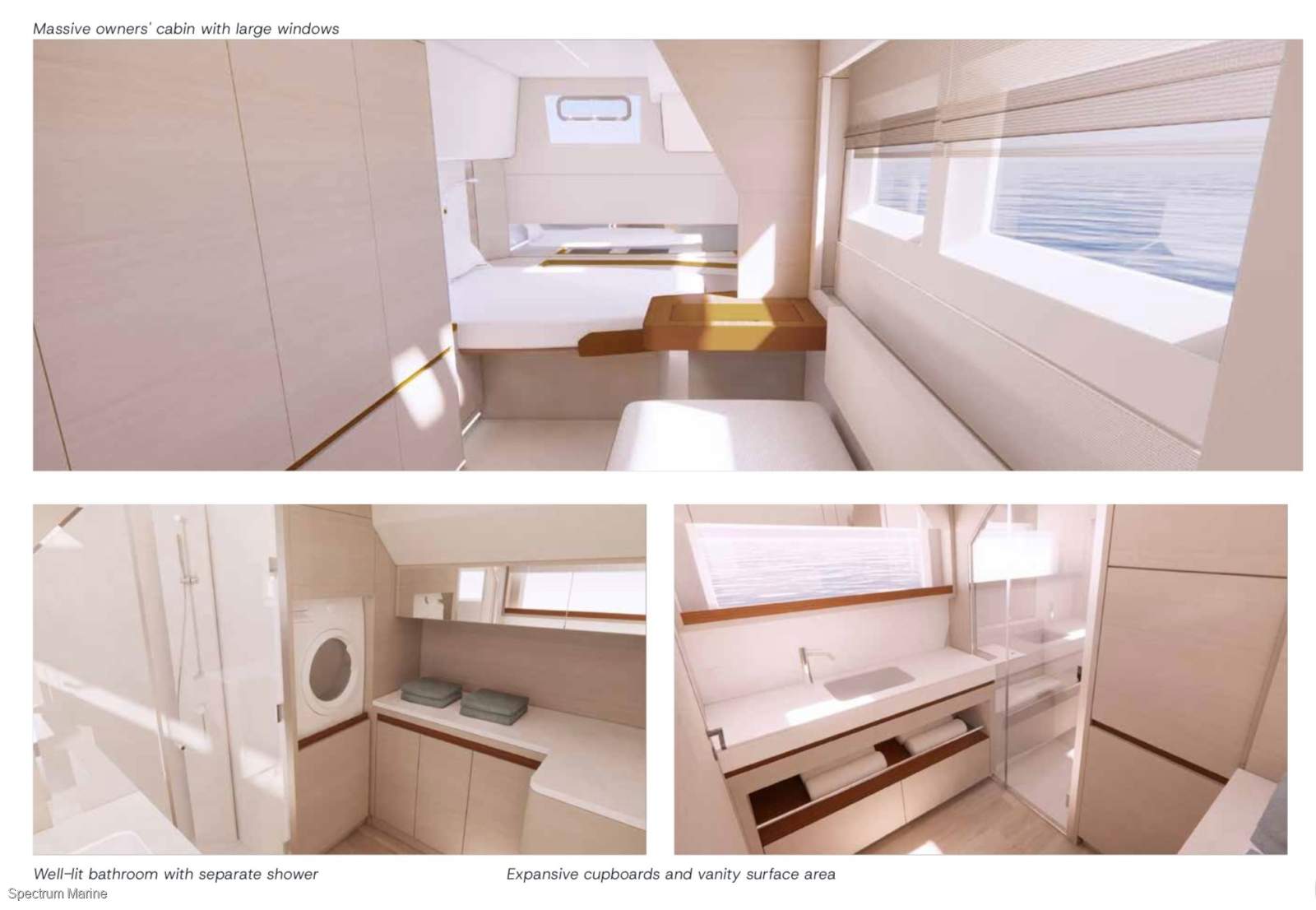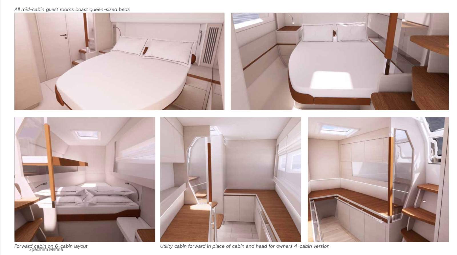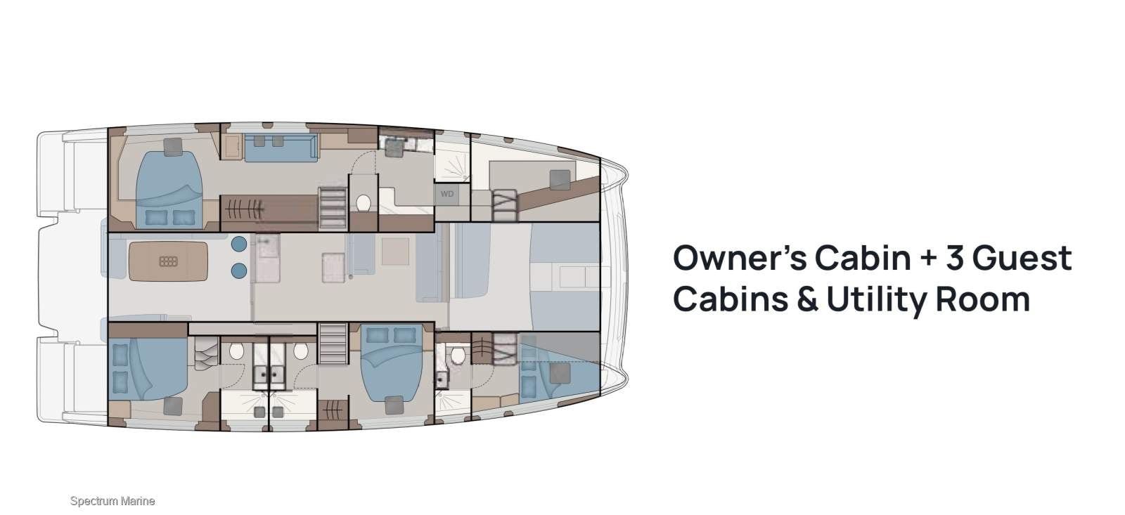 4 Bedroom Layout: Owners Cabin full length Port Hull + 3 Guest Cabins to Starboard Hull, Utility Room to Port