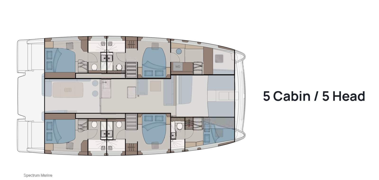 5 Bedroom Layout: 2 x Island Queen Midships, 2 x Queen Aft, 1 x Double Starboard Forward, Utility Room to Port