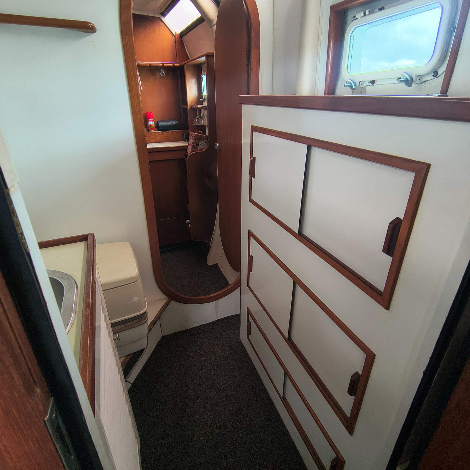 Down galley with plenty of storage space. Double sink with electric pump for both fresh and salt water. All pans, crockery, cutlery etc