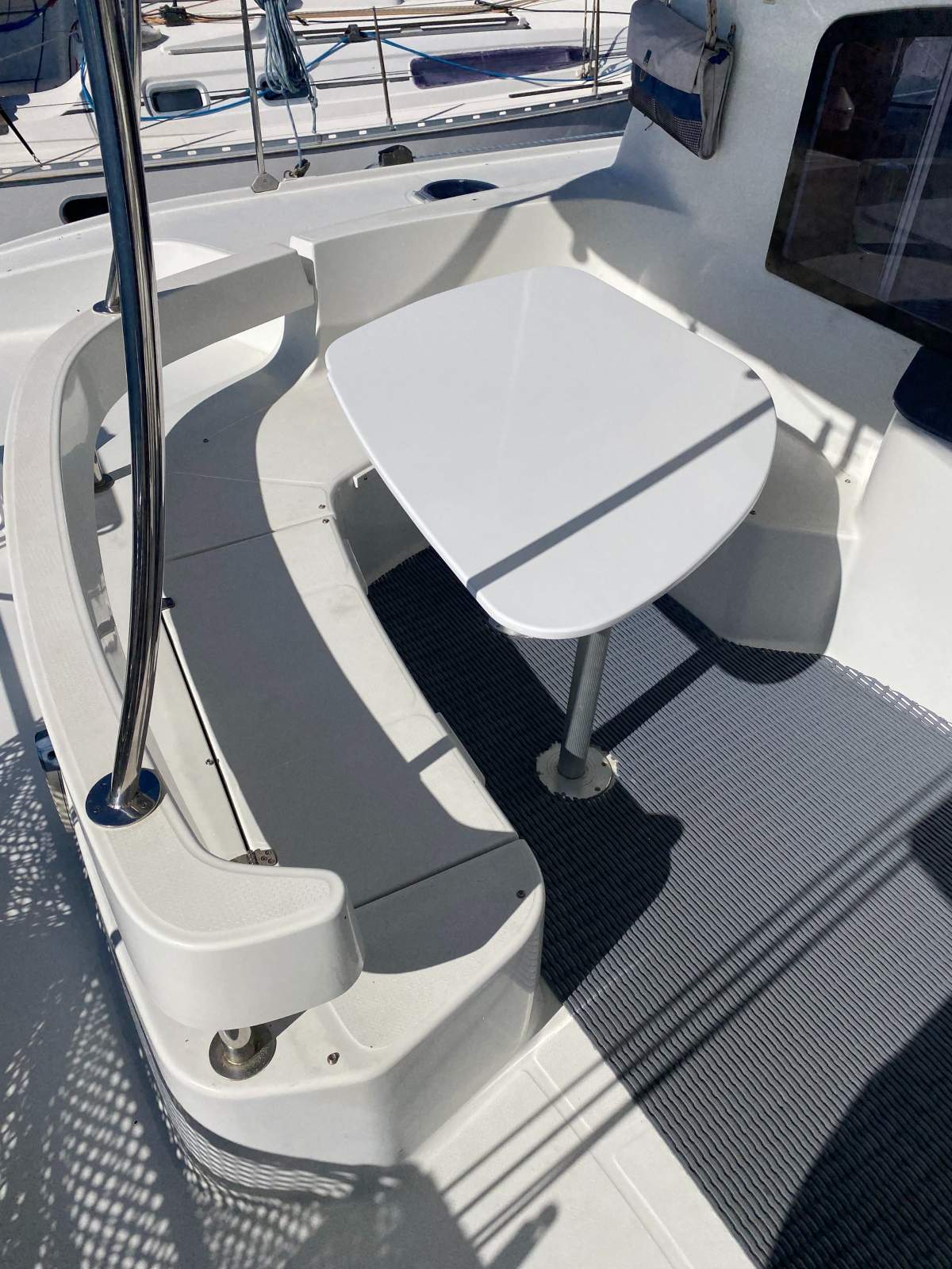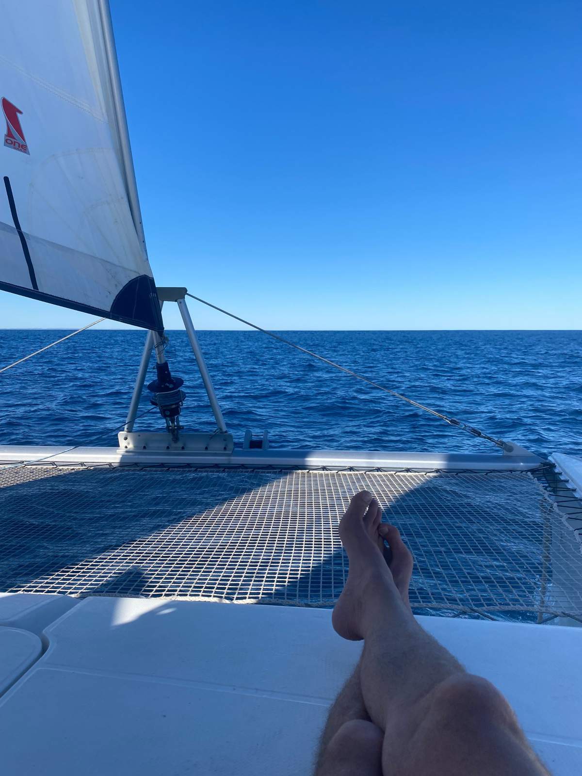 Very easy to sail, cruises along at 8-10kts (faster with a following sea), and best of all your friends sit around the outdoor lounge whilst underway with their drinks and snacks sitting firmly on the table while you keep lookout with the autopilot on. Monohull sailors are jealous of your speed, comfort, and the fact you are sailing flat while they are heeled right over, even upwind. Power boaters are burning $100's of dollars of fuel while their spines are rattling and yelling their conversations to each other while breathing in diesel fumes. Even on dead flat windless days the small diesels effortlessly glide you along at 7 kts sipping 1.5 litres an hour each. Go and sit on the tramp and you can't even hear them!