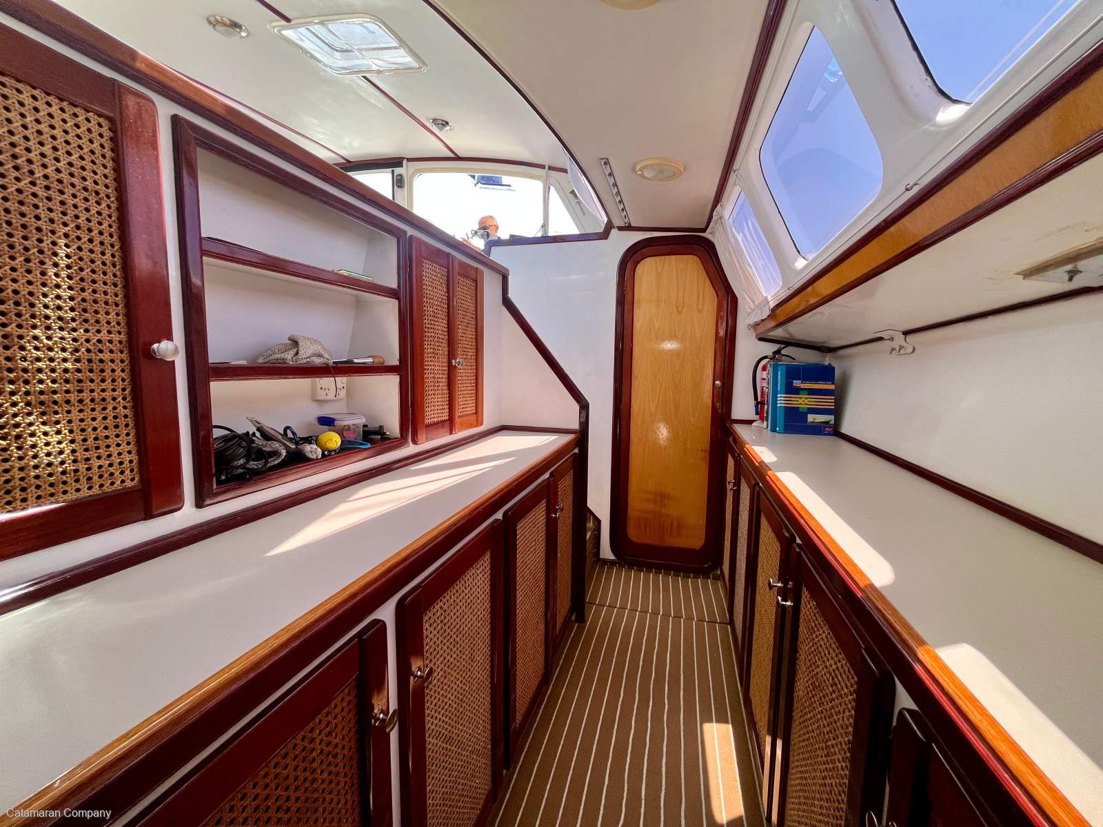 Her interior is thoughtfully laid out for comfortable liveaboard or extended cruising, featuring an aft-facing navigation station, an L-shaped saloon lounge, a starboard midships galley, a spacious full bathroom and double berth forward in the port hull, while the starboard hull offers a ¾ double berth aft, a forward double berth with an additional crew berth in the bow, and a private ensuite toilet and vanity.