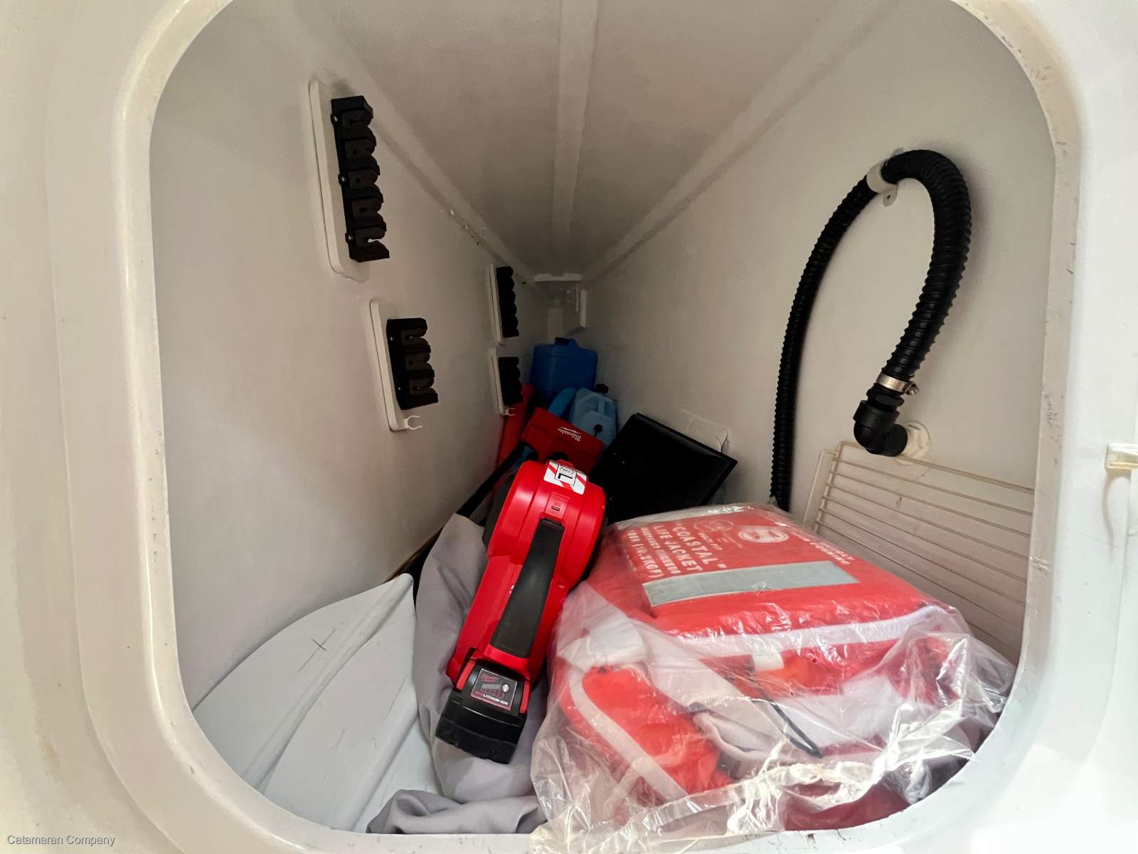 Midships in the starboard hull it is equipped with a Double stainless sink, Anko microwave, Water filter Stefani Twin Undersink, plenty of bench of space for food preparation and lots of storage cupboards.