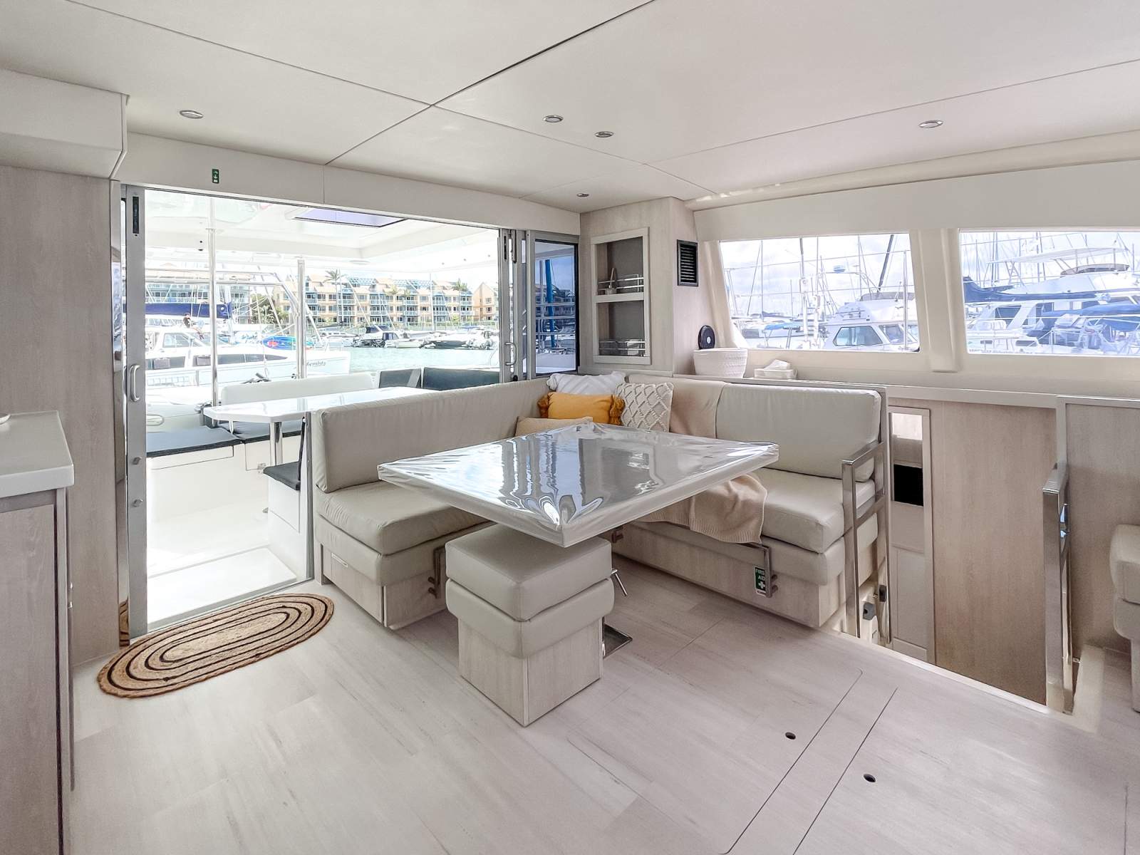 Configured with the sought-after four-cabin, two-head layout, this vessel offers exceptional comfort for family cruising or charter guests. The bright, open-plan saloon, forward galley, and internal access to the forward cockpit create a welcoming and social atmosphere rarely found in a catamaran of this size.