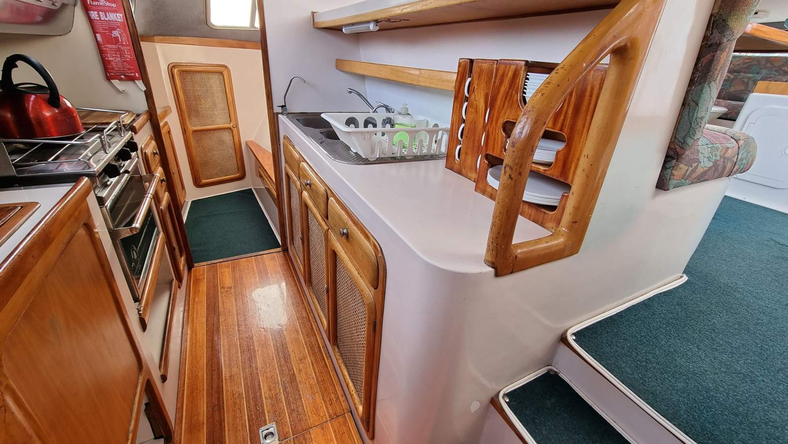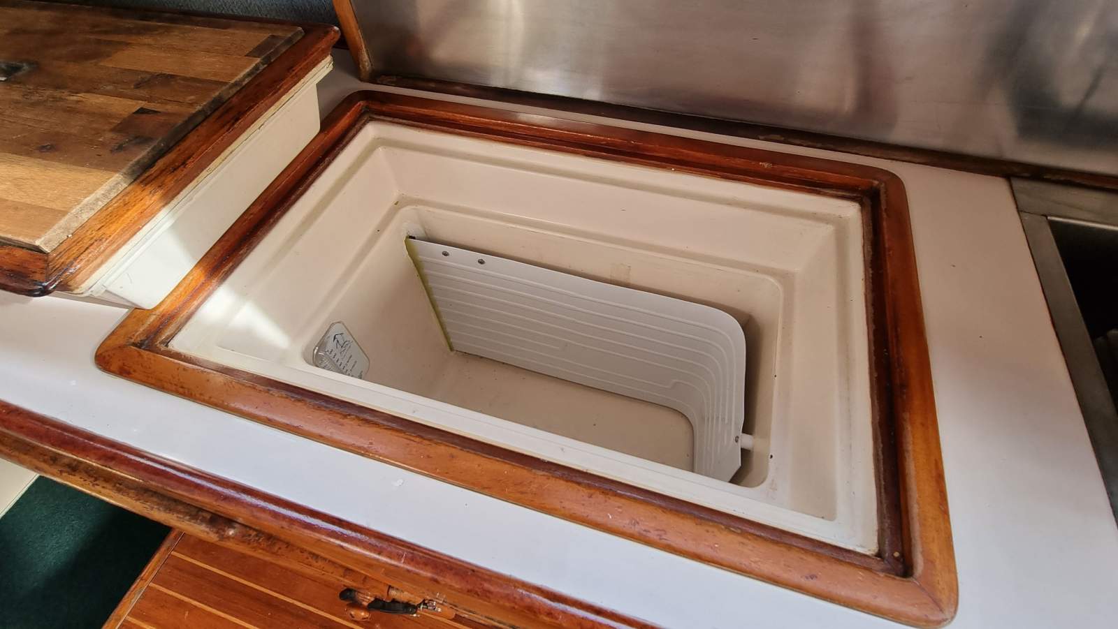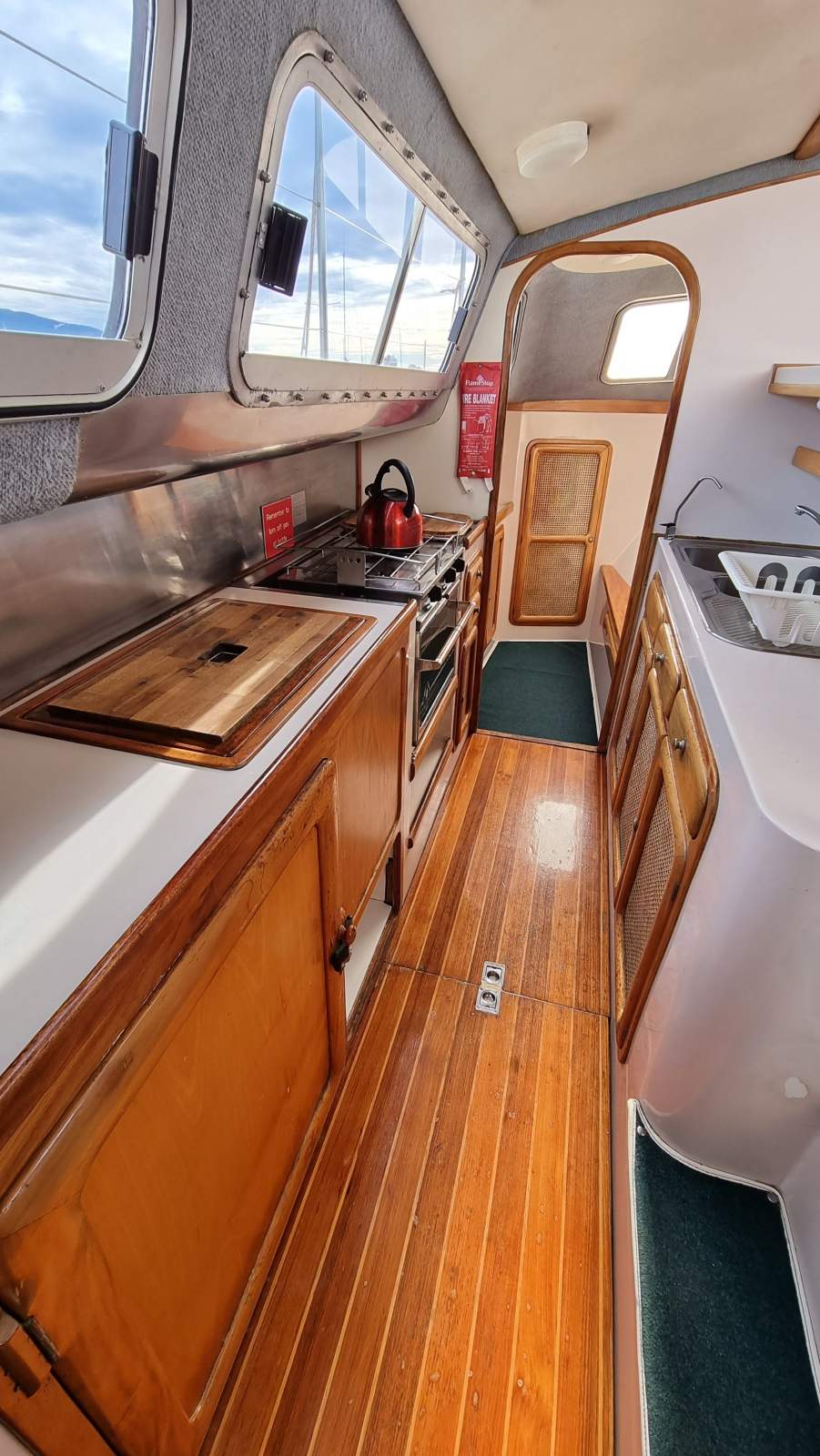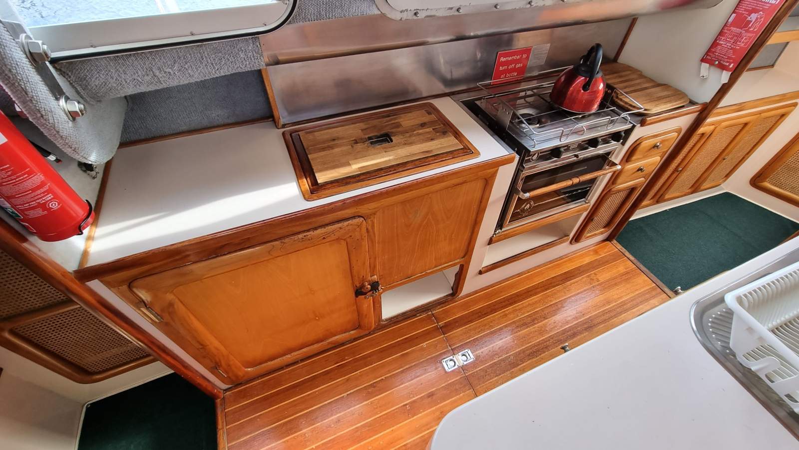 The galley to port is nice and roomy. The outer bench with stainless steel splash-back incorporates the oven, front-loading fridge, top-loading freezer and utensil drawers.