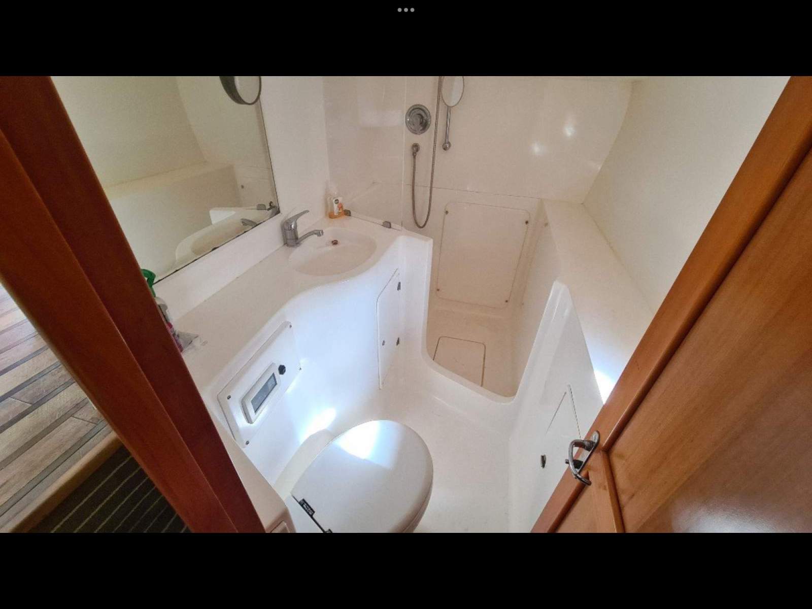 In the center is the walkway with lots of storage, and aft of this is the huge bathroom with a separate shower, electric head, and sink.