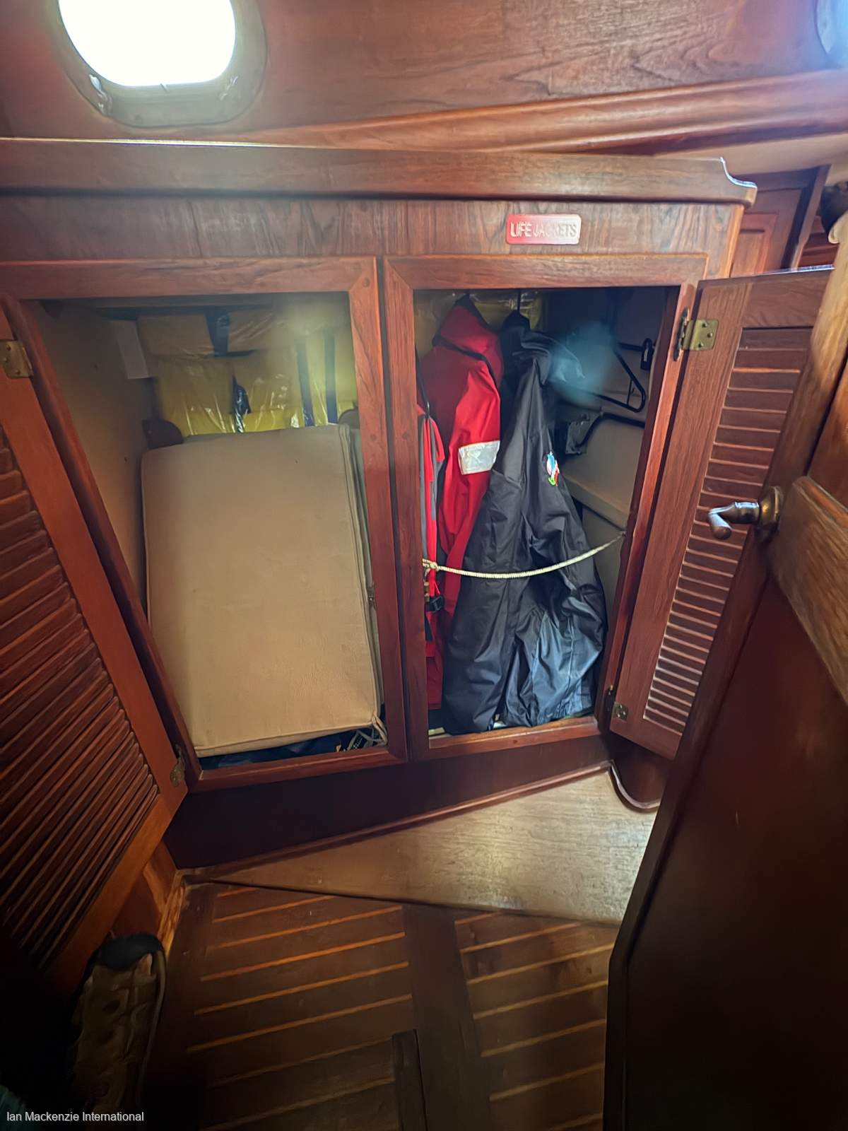 There is a enclosed bathroom forward to starboard with toilet and shower and a large hanging and shelf locker opposite.