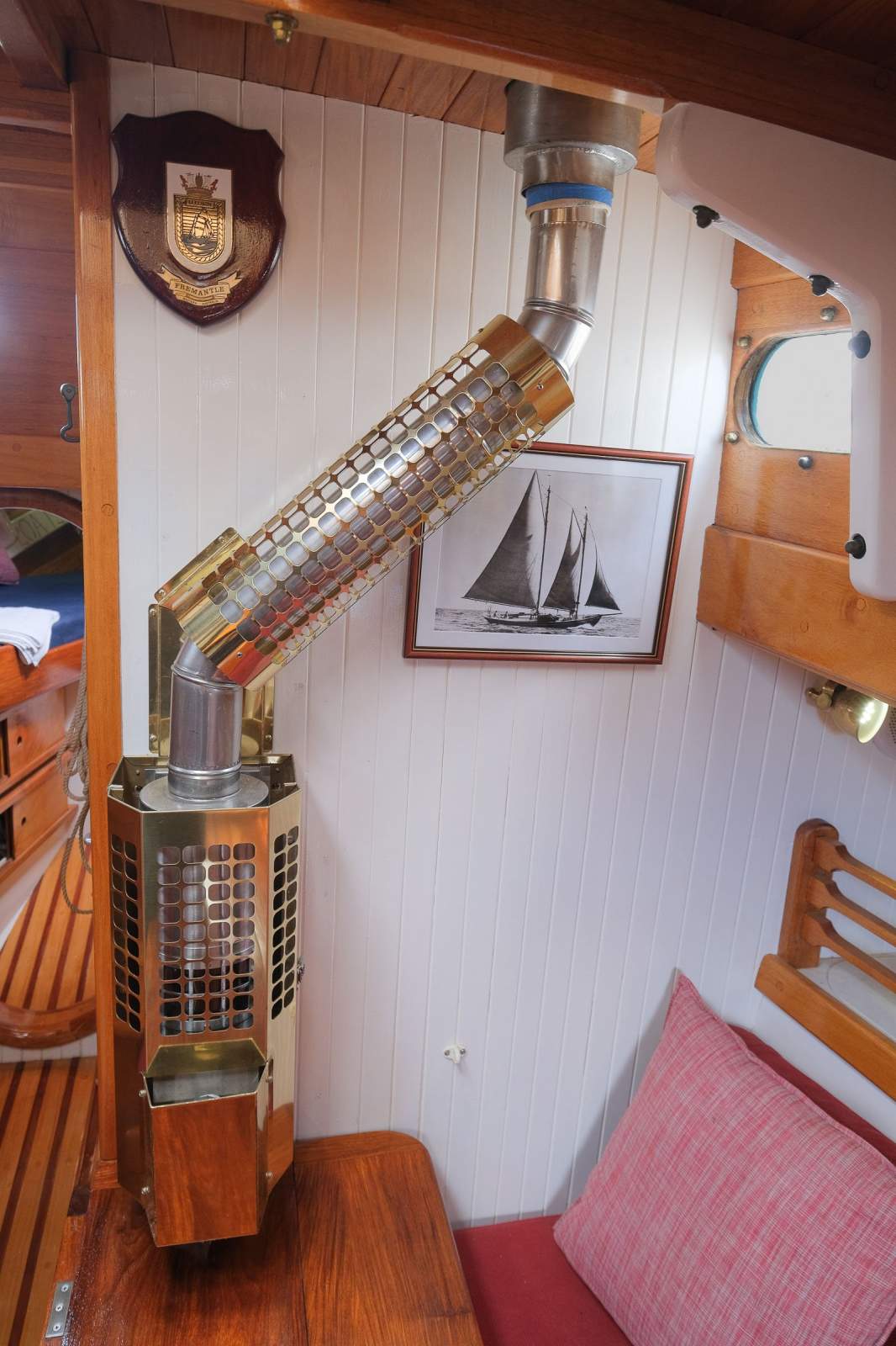 Stepping down the companionway, you're welcomed into an interior brimming with the charm of a bygone era. The saloon is intimate and wonderfully cosy, with two generous settees flanking a fold-out dining table. A diesel heater adds a thoughtful touch, and it's easy to picture yourself unwinding with a good book and a favourite glass of red on a cold winter's evening. The timberwork is simply stunning, showcasing a rich blend of exotic species including Papua New Guinea Rosewood, Huon Pine, Spur Mahogany, White Beech, and Queensland Maple.