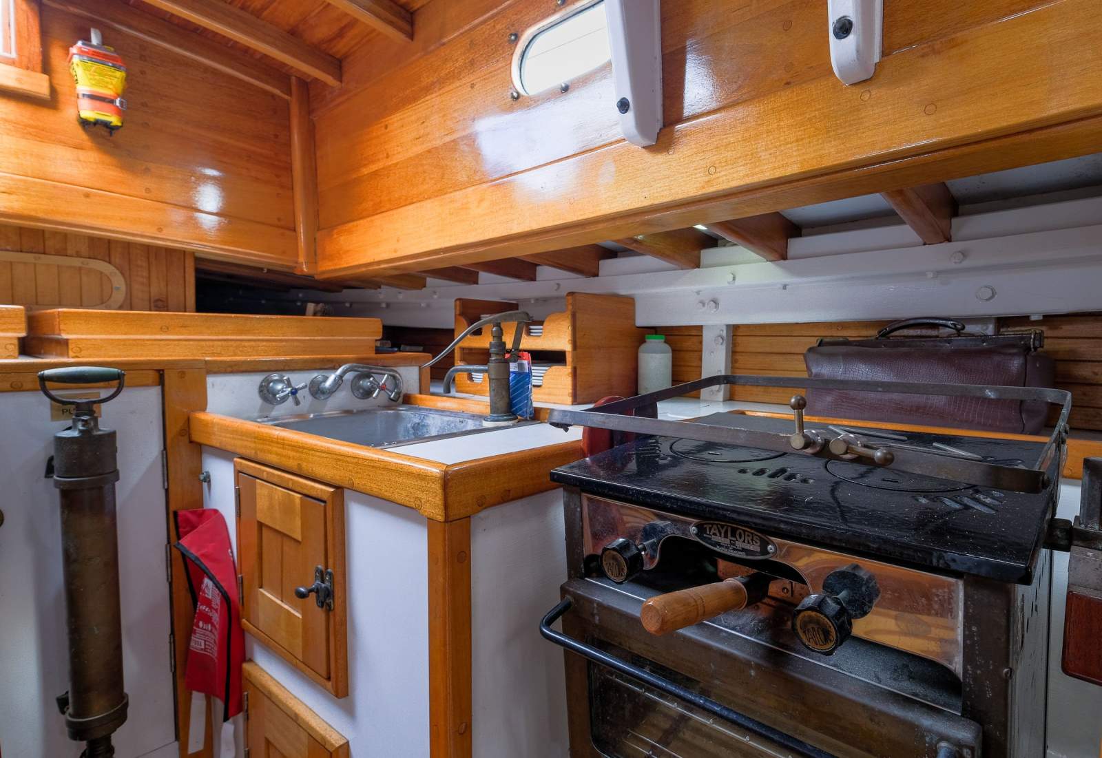 The galley is refreshingly simple and purpose-built for life aboard. A beautiful Taylors metho stove and oven take pride of place -- a hand-built English classic renowned for quality, with new units retailing in Australia for around $16,000. The stove is fuelled by a generous paraffin tank, efficiently pressurised with a bicycle pump. Adjacent to the galley on the starboard side is a top-loading 12-volt refrigerator, neatly integrated and ideal for extended cruising.