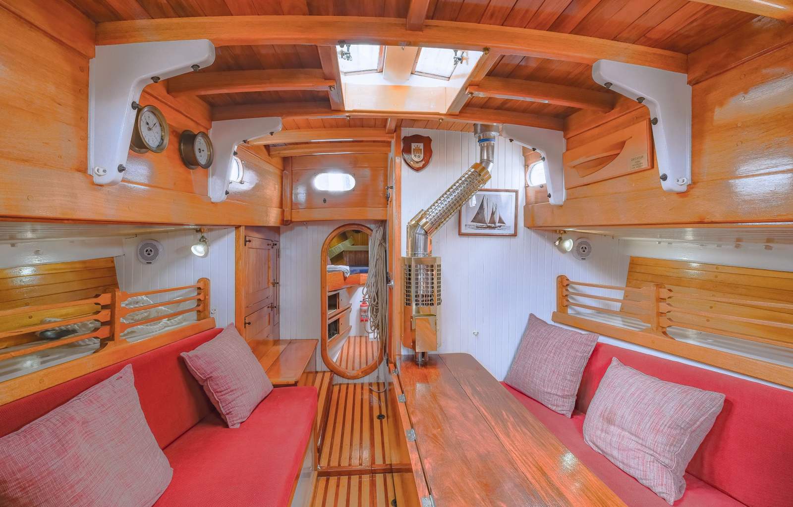 The master cabin lies forward in the forepeak, offering twin single berths in a space that feels both intimate and timeless. Once again, the timberwork and detailing are simply breathtaking -- the kind of craftsmanship that quietly leaves you speechless and reminds you this yacht is truly something special. In the saloon, both settees are fitted with lee cloths, converting easily into secure and comfortable sea berths while underway. An additional single quarter berth to starboard provides further accommodation, thoughtfully arranged for life at sea.