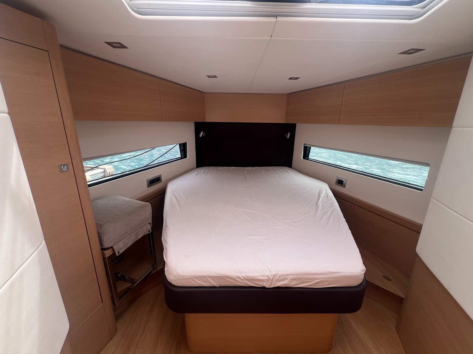 Designed for effortless short-handed sailing, she features electric winches, in-mast furling mainsail, self-tacking staysail, and all controls led back to the protected central cockpit. Offshore navigation is exceptional with a comprehensive Garmin suite including touchscreen chartplotter, radar, sounder, and AIS, plus Iridium GO satellite connectivity. Below deck, the light oak interior is bright and welcoming, with twin fridge drawers, custom upholstery, and practical cruising additions for extended living aboard.