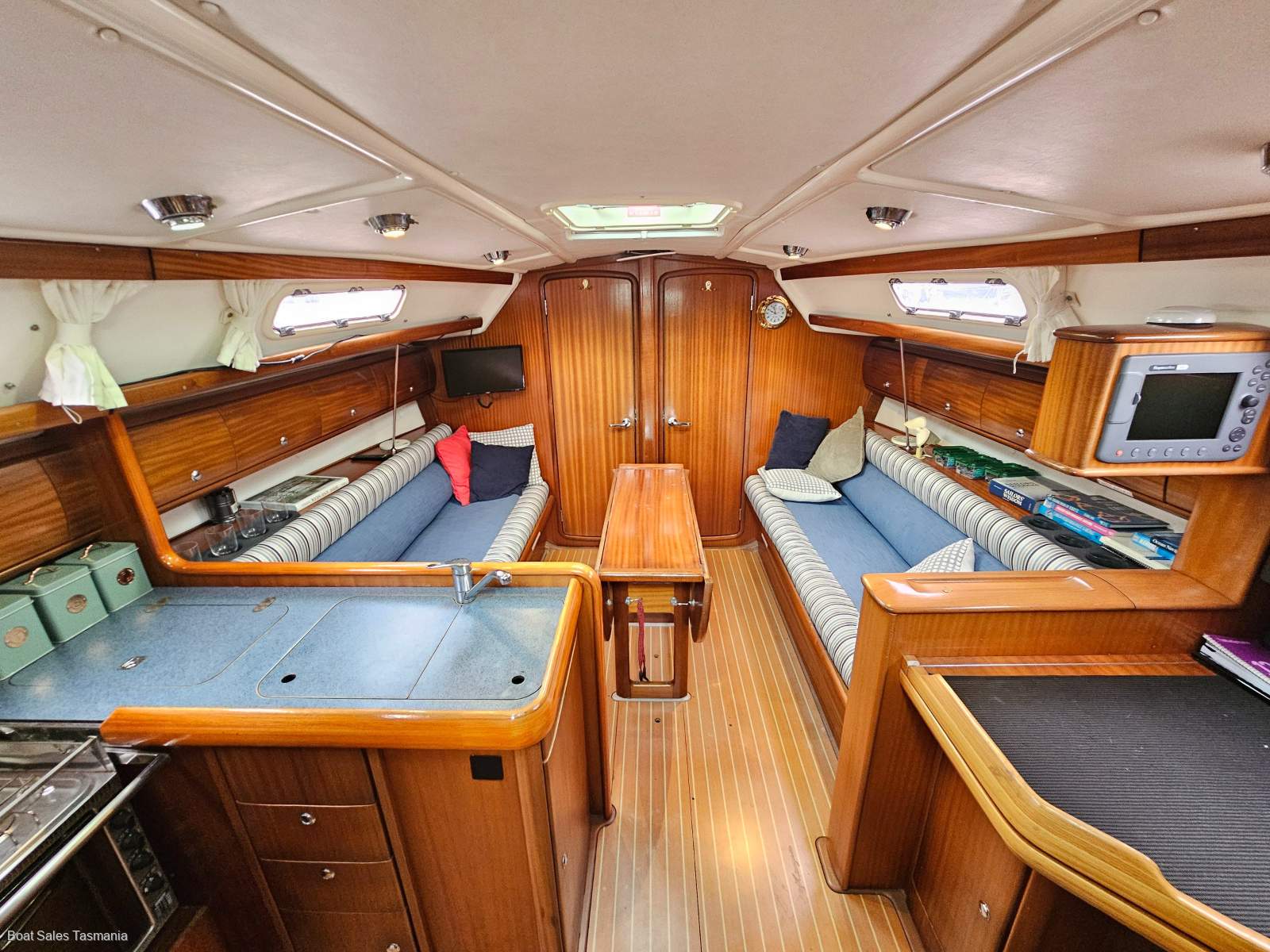 The L-shaped galley to port is designed for practical cruising, offering excellent bench space, deep storage, and secure bracing points underway. It features a three-burner gas stove with oven, a large top-loading fridge, stainless steel sink with pressurised hot and cold water, and well-organised lockers for provisions and cookware. It's a functional, easy-to-use workspace that makes meal preparation simple whether at anchor or on passage.