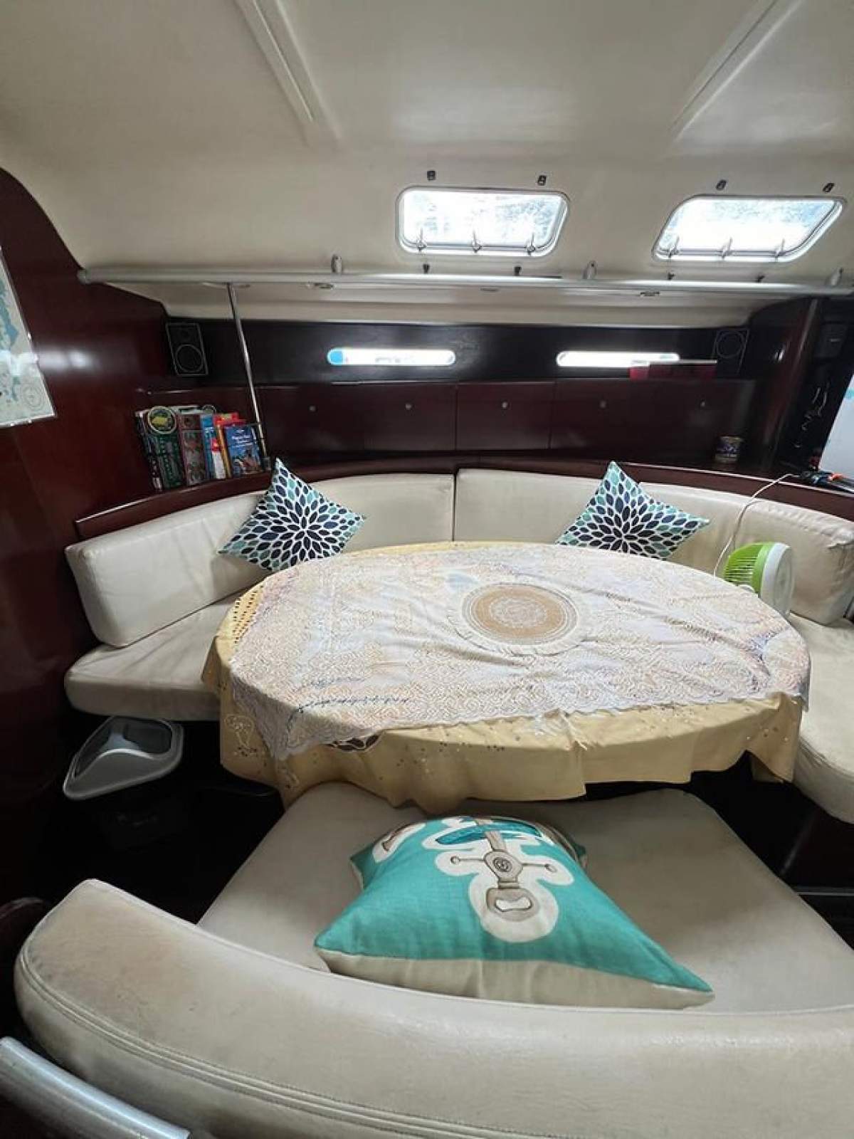 This is a very comfortable 3 Cabins version, Owner master cabin and 2 aft cabins, can sleep 8. Two heads with showers, she looks in excellent condition with leather cushions and a really beautiful and comfortable design and all dark mahagony wood.