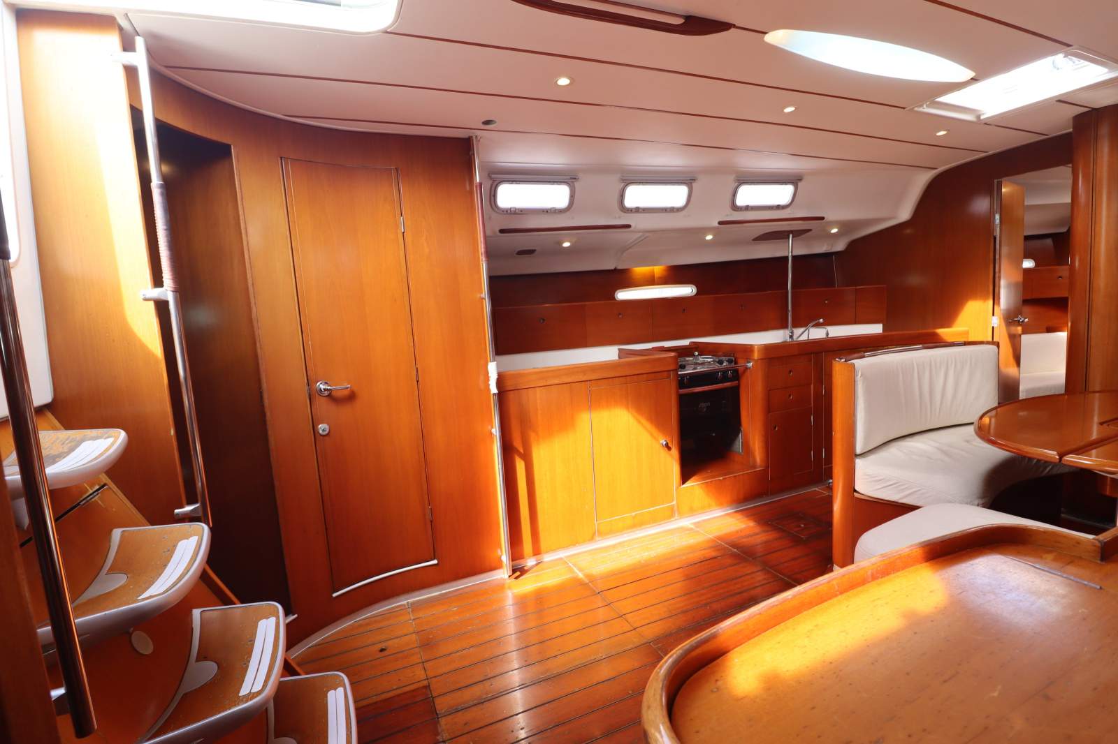 Downstairs, Carla M impresses with a level of fit-out and joinery rarely seen in modern production yachts. The 3-cabin, 2-head owner's version is spacious, light-filled and exceptionally well ventilated via numerous opening hatches. Despite her racing pedigree, she offers genuine cruising comfort, with timberwork, upholstery and fittings all in excellent condition, showing only minimal and honest signs of use consistent with her age.
