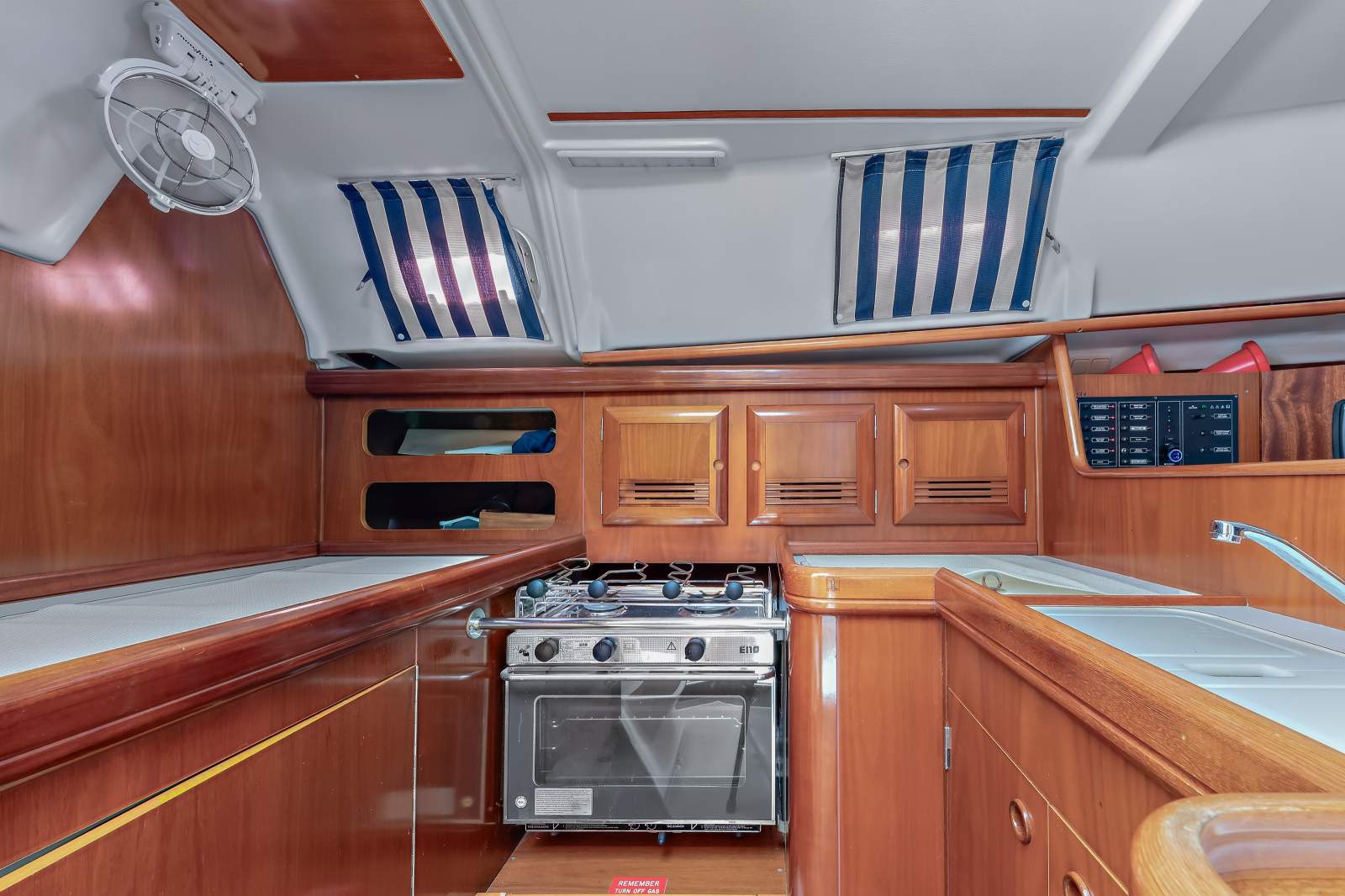 U-shaped galley. Oven with cooktop. Twin stainless-steel sinks. Large top-loading freezer. Seperate front-loading fridge.