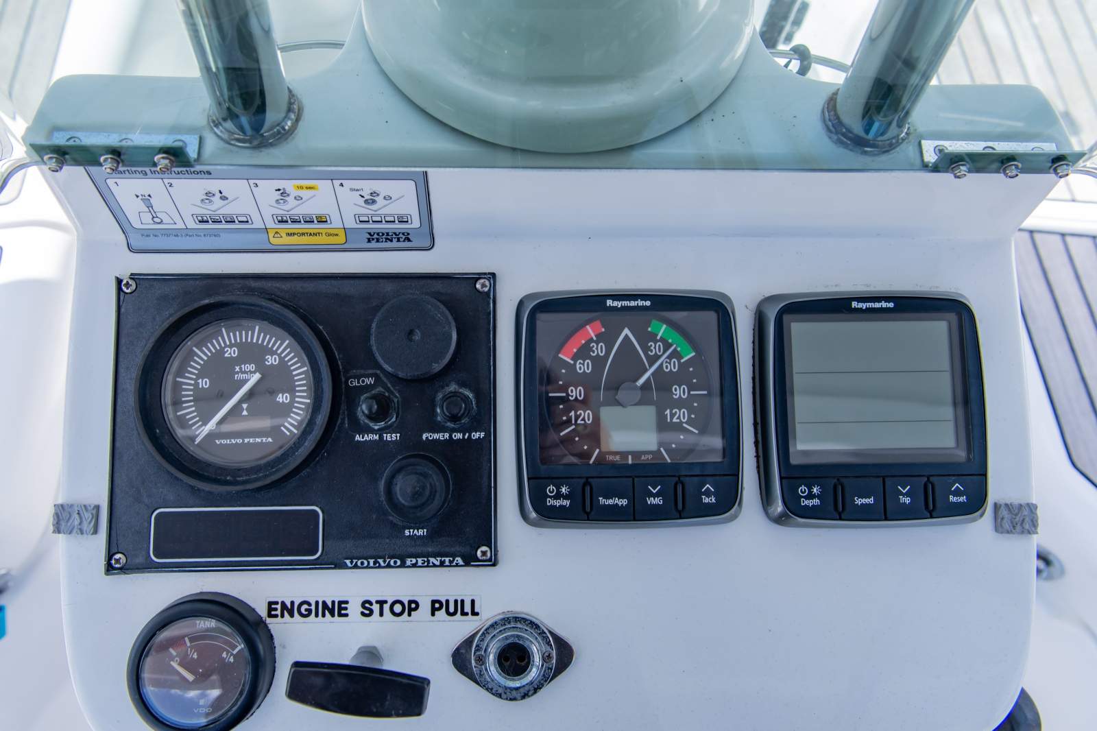 every timber and varnished surface gleams as new. Electronics include a Raymarine MFD GPS/plotter/radar at the helm and a backup Garmin GPS/fish finder at the chart table.