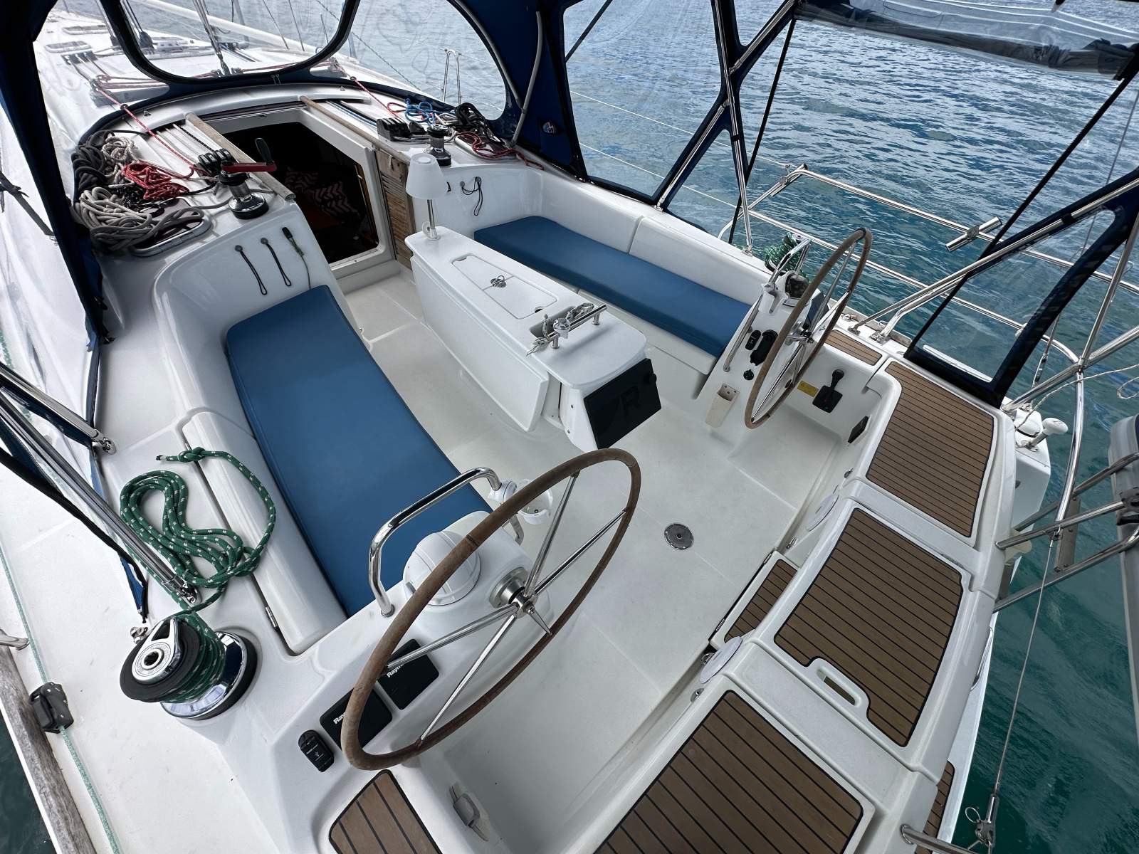 Built with a solid GRP displacement hull and fin keel with bulb for enhanced stability, she features a powerful yet easily managed fractional sloop rig. The twin helm cockpit offers excellent visibility, safe movement underway and generous entertaining space at anchor or in harbour, making her equally suited to family cruising and social sailing.
