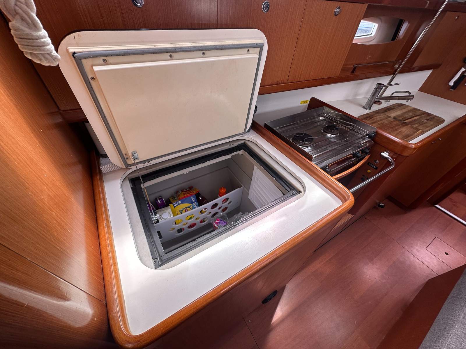Below decks, the spacious four cabin layout offers impressive accommodation for family and guests. The bright saloon features an L shaped settee, convertible dining table and excellent storage throughout. The well appointed galley includes double stainless steel sinks, refrigeration with freezer capability and an ENO two burner stove with oven, ideal for extended cruising.