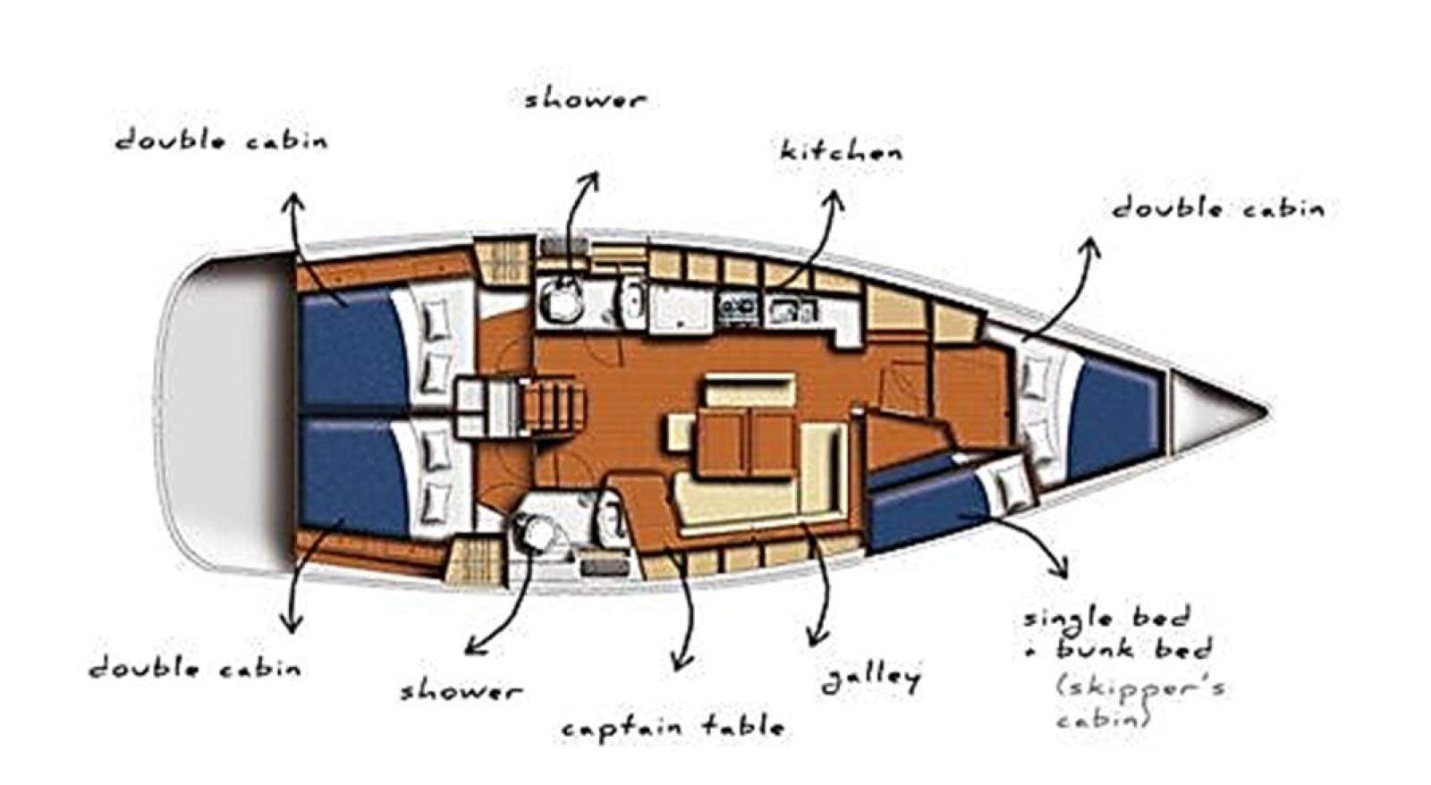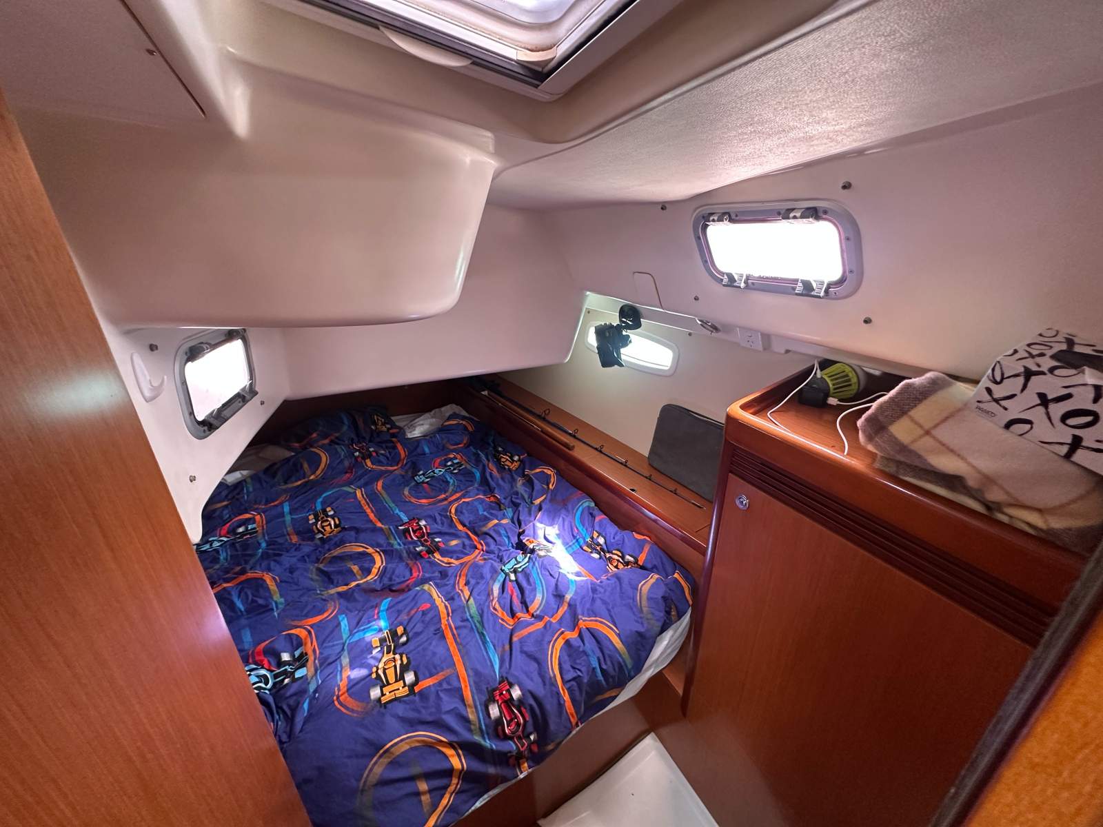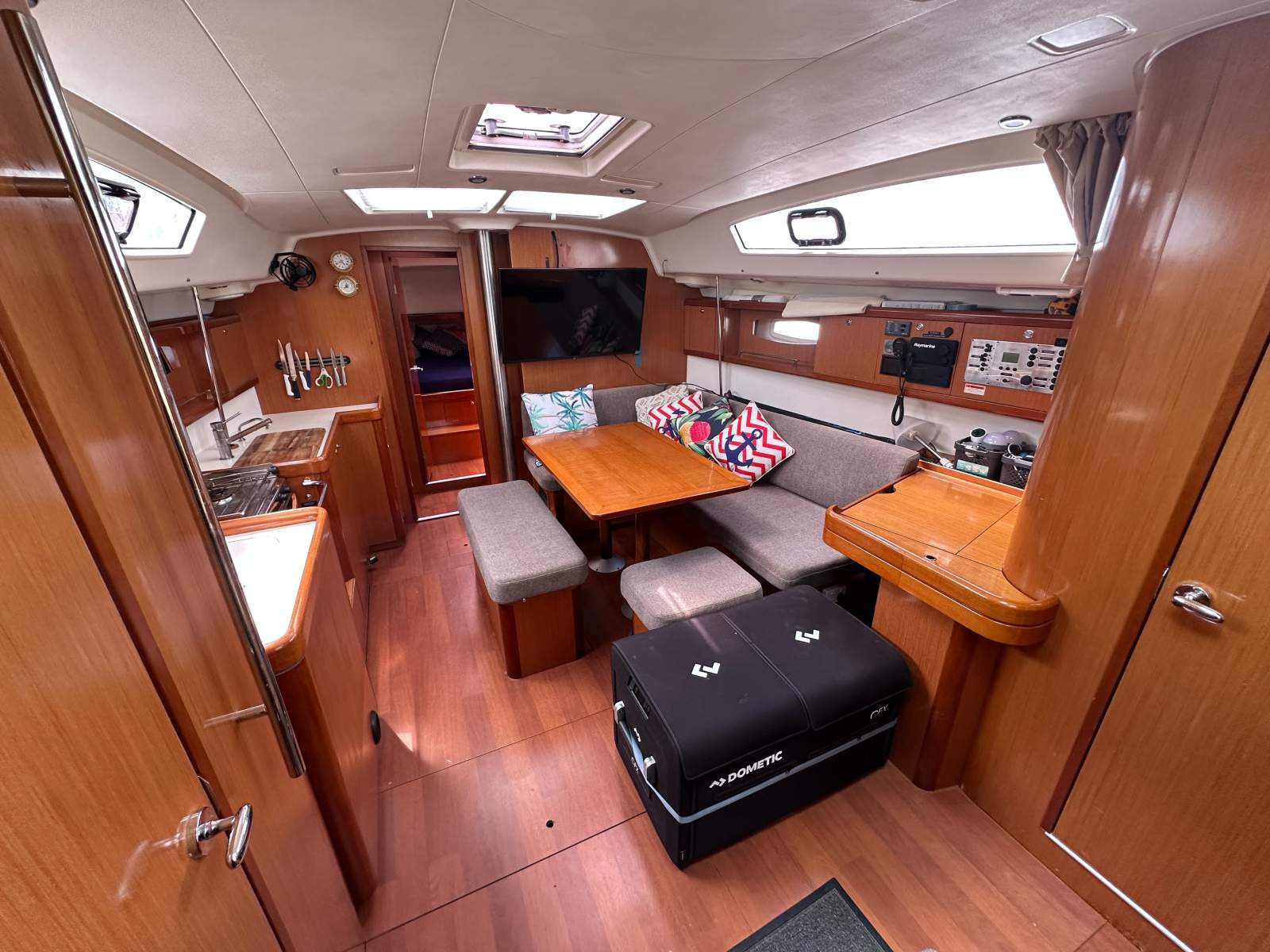 Accommodation comprises a forward double cabin, twin single cabin and two generous aft doubles, supported by two heads with showers. Ventilation is excellent thanks to multiple deck hatches, portlights and fans throughout.