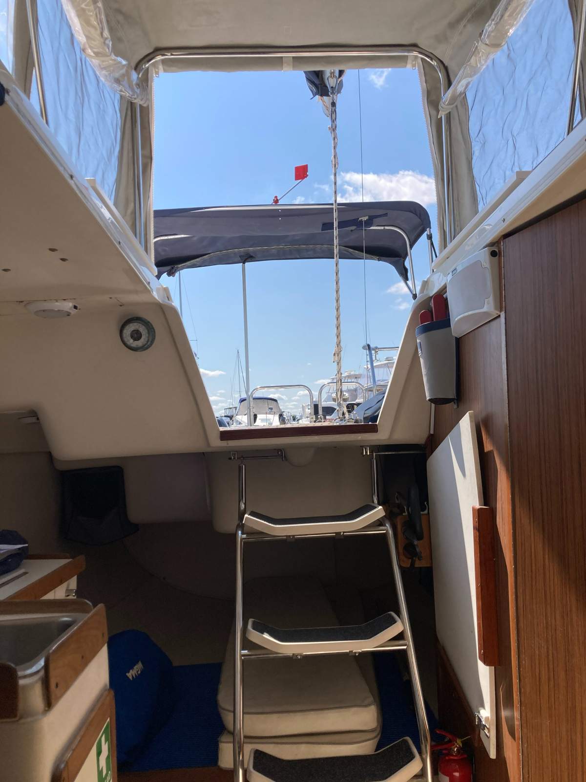 The bulkhead free fully open spacious cabin area sleeps 6 with a huge double bed under the stern area having an opening hatch, and double "V" berth in the bow.