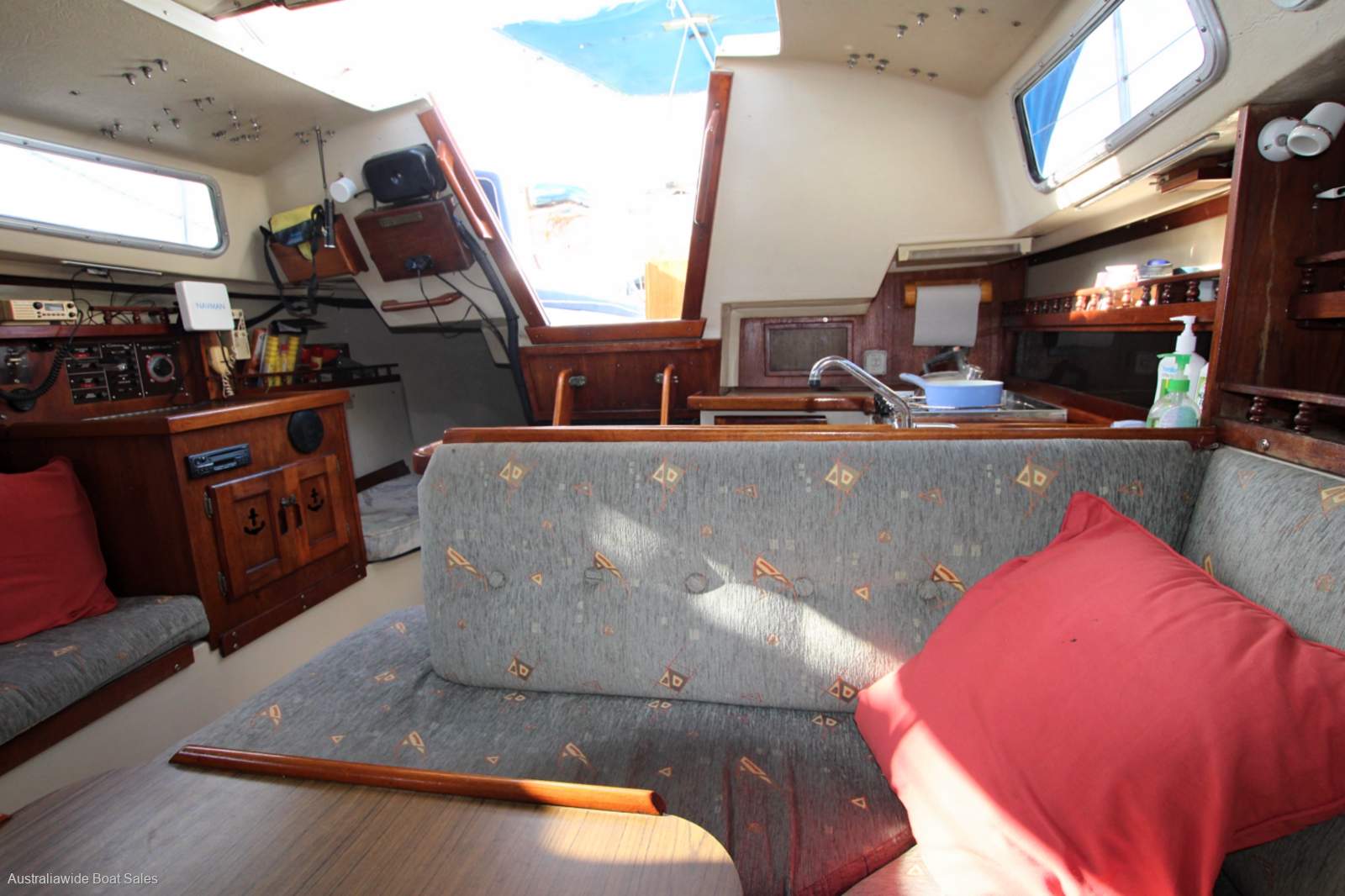 Stainless steel wheel helm, cockpit table, lockers and cushions, step through transom with swim ladder, outboard bracket, cockpit sun seat, self tailing winches, grab rails, fenders and mooring lines.