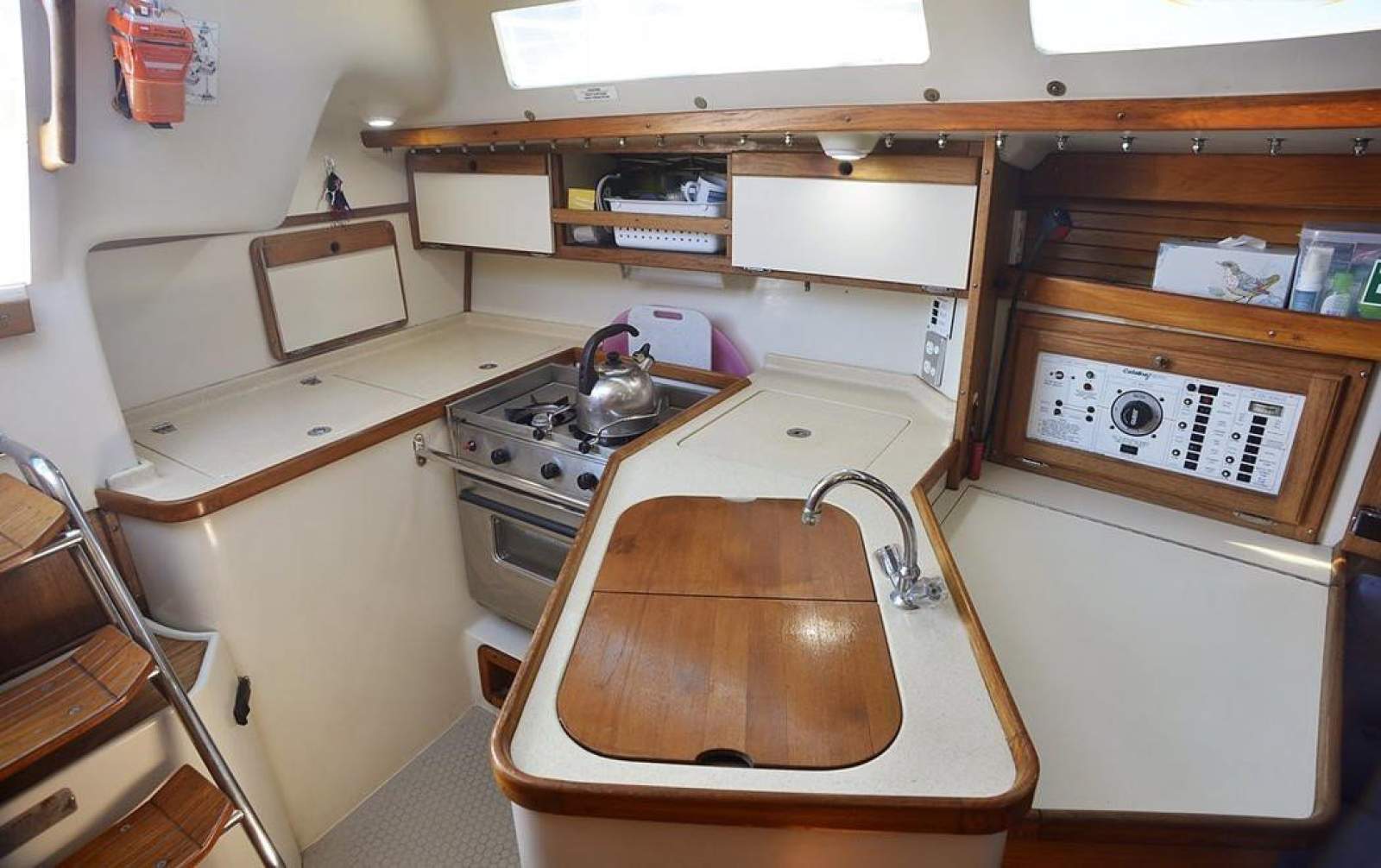 Generous U-shape Galley, 2 x deep SS sinks, under-counter extra large Refigerater, under-counter Pantry box, loads of storage compartments under sink and overhead