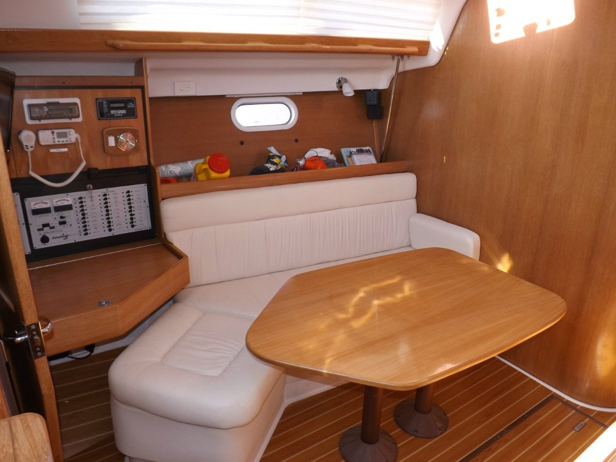 Cockpit table, cushions, custom stainless steel dinghy davits, barbeque; Harken self tailing winches x4- stbd halyard winch is electric; raised detachable helm seat