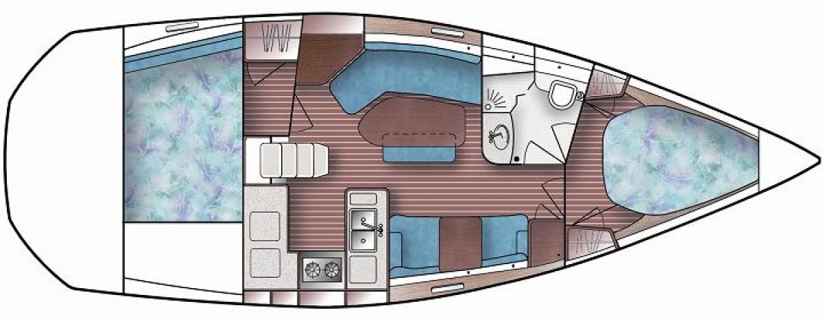 Island double v berth forward, head/shower to port, saloon berth near dinette to port, galley to stbd, nav stn to port, double cabin aft athwartships. Interior finished in quality teak with white ultraleather upholstery and inner spring mattresses.
