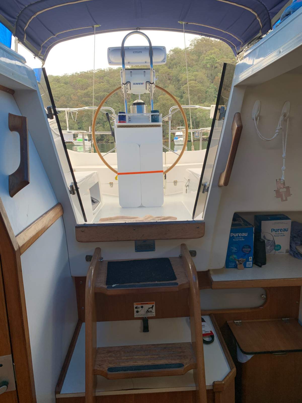 Great user friendly L shaped galley on the port side with gimballed cooktop and oven. Double bowled sink pantry, microwave, large fridge and large coolbox both top loading great condition.