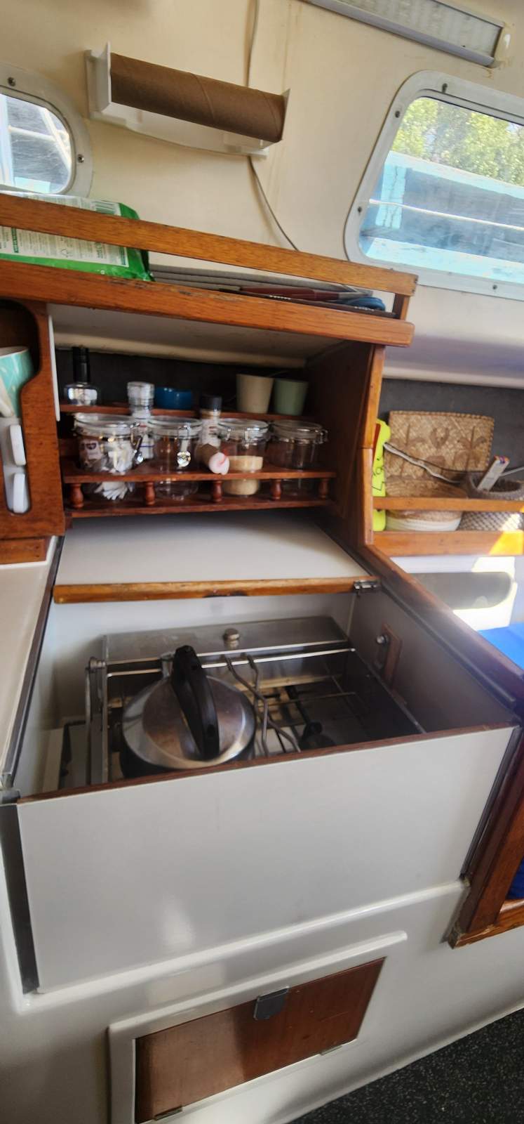 Functional Galley: Metho 2-burner stove, stainless sink, ample cupboard space, 12V Fridge Freezer