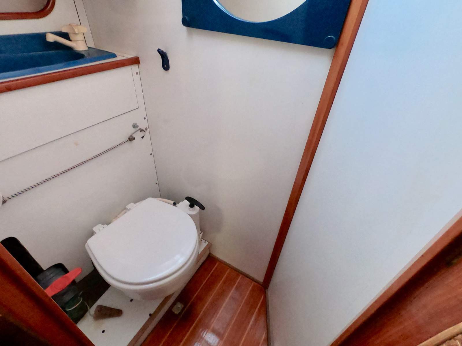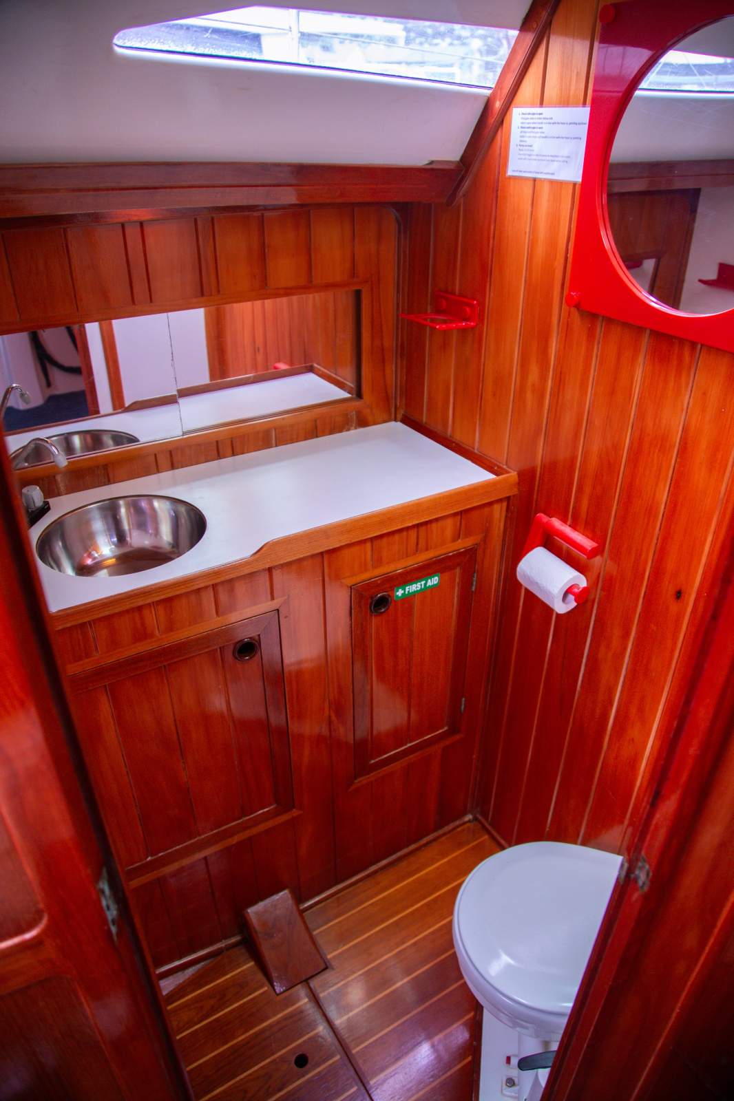 Spacious Forward Starboard Bathroom with S/S Vanity & Manual Toilet. Portside Aft Cabin Ensuite with Manual Toilet & Vanity.