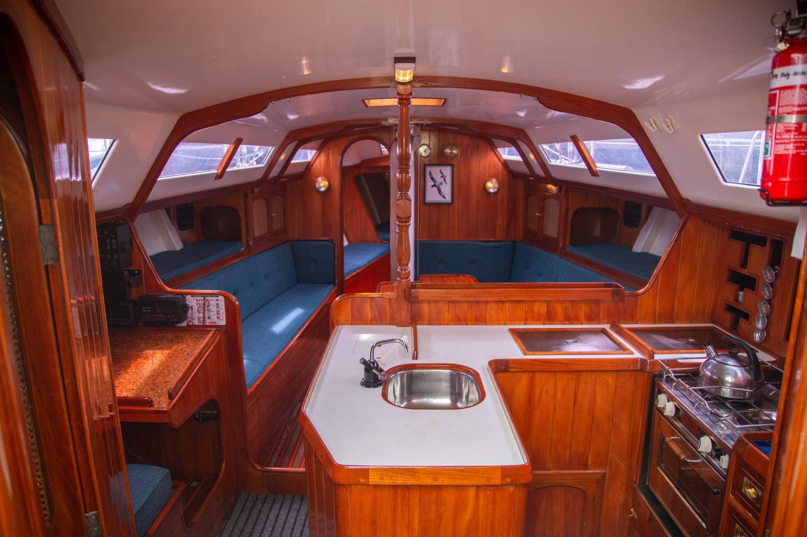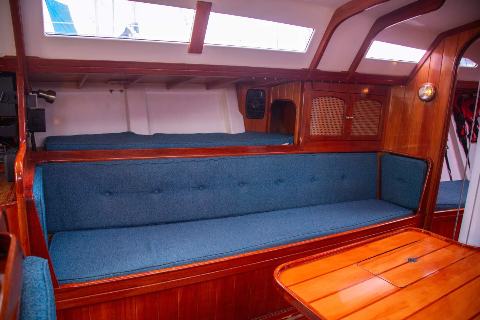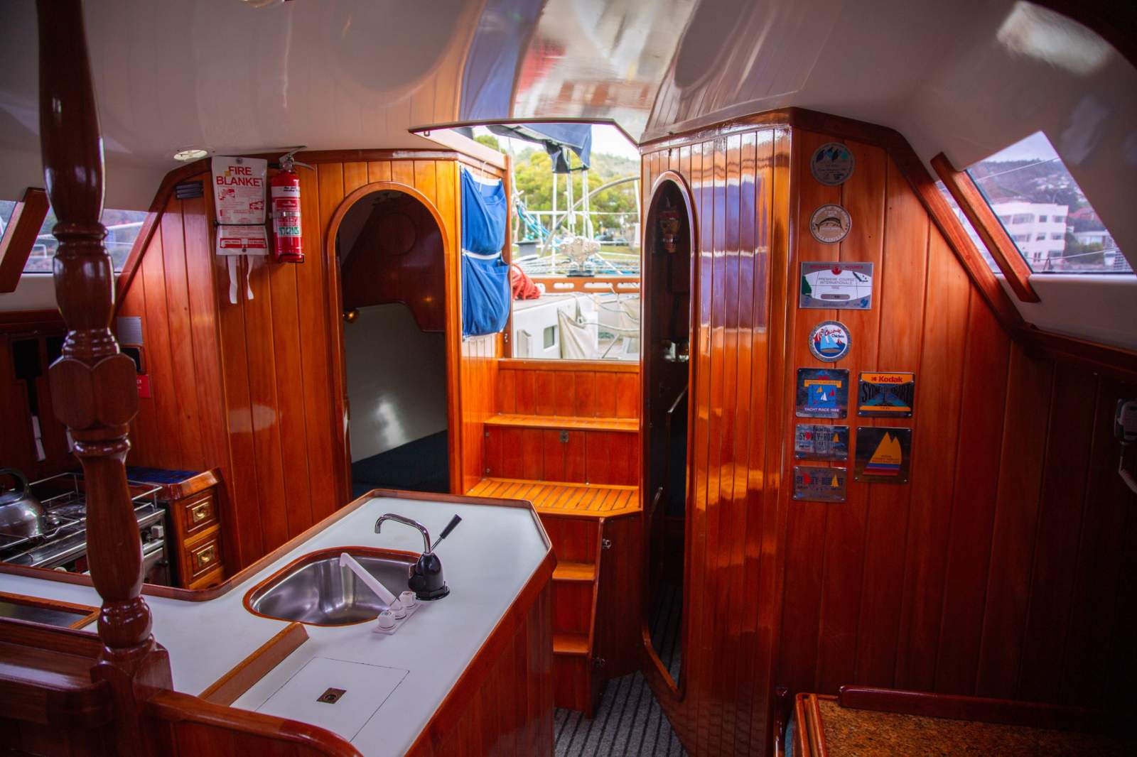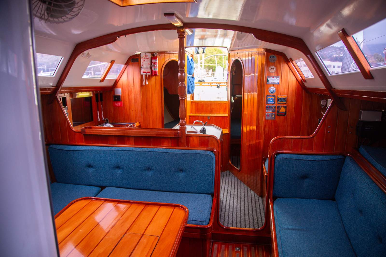 Stepping inside, the interior simply gleams with rich gloss varnished timber beautifully paired with clean white finishes to create and light and welcoming ambience. The generous saloon features a large dinette, with seating for 12 in comfort on the neatly upholstered settees. The accommodation is ideal for anything from comfortable cruising with family and friends, through to the full race crew. Forward is the spacious master suite with a large double v-berth, seating, and full ensuite with toilet and vanity. Aft are two private double cabins, with a second bathroom to port. The saloon provides four single berths when additional accommodation is required. The well appointed U shaped galley is to starboard and features a large top loading fridge and freezer (with a NEW compressor), two burner stove with oven (with NEW gas lines and regulator), stainless steel sink with fresh water, and ample storage space. The package is complete with a traditional chart table with the NEW chart plotter and VHF Radio.