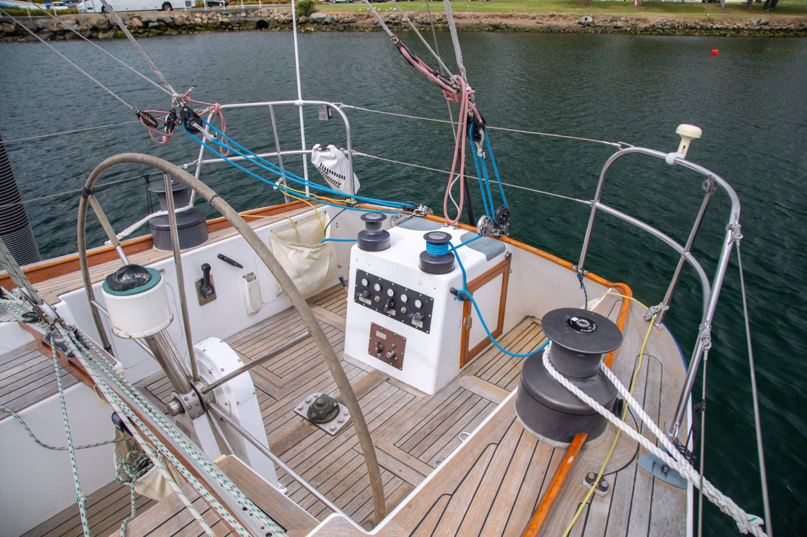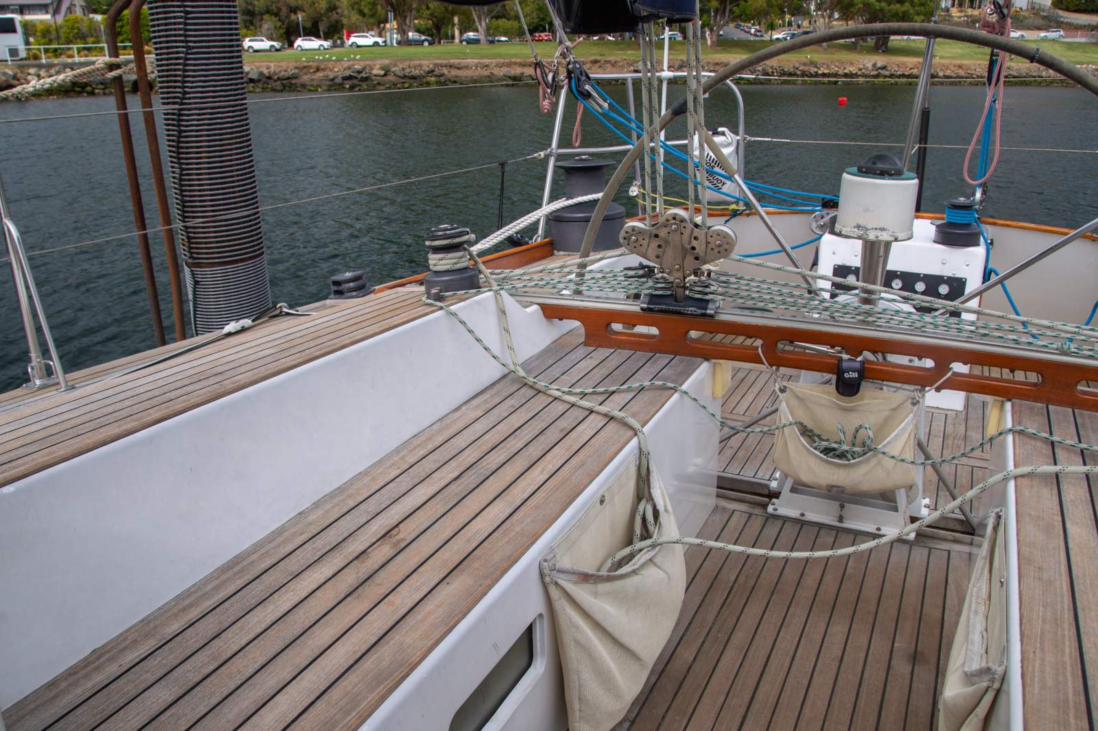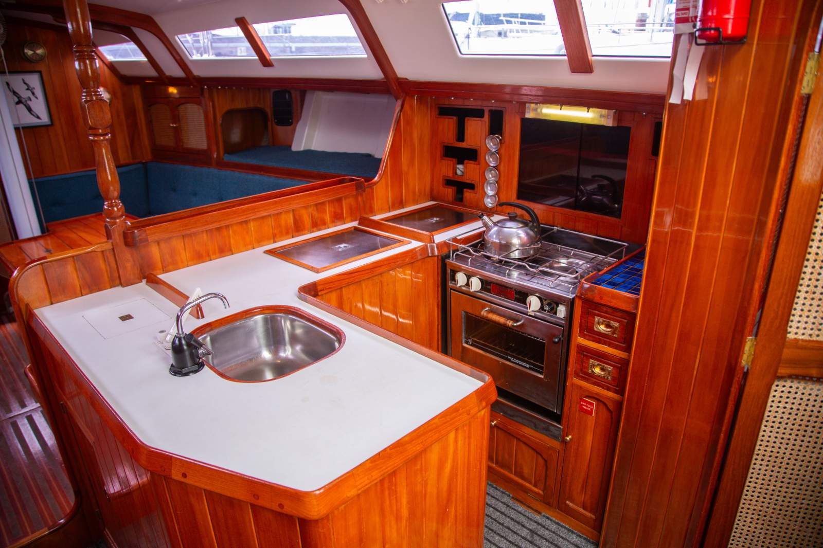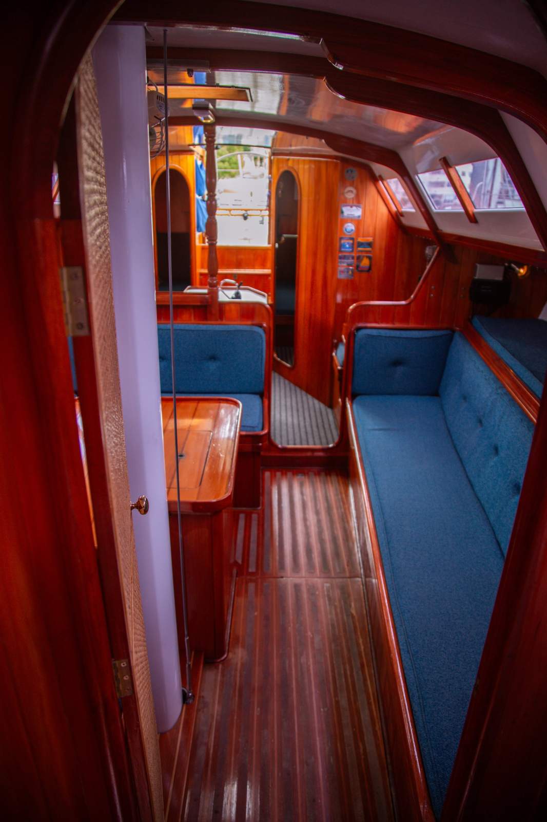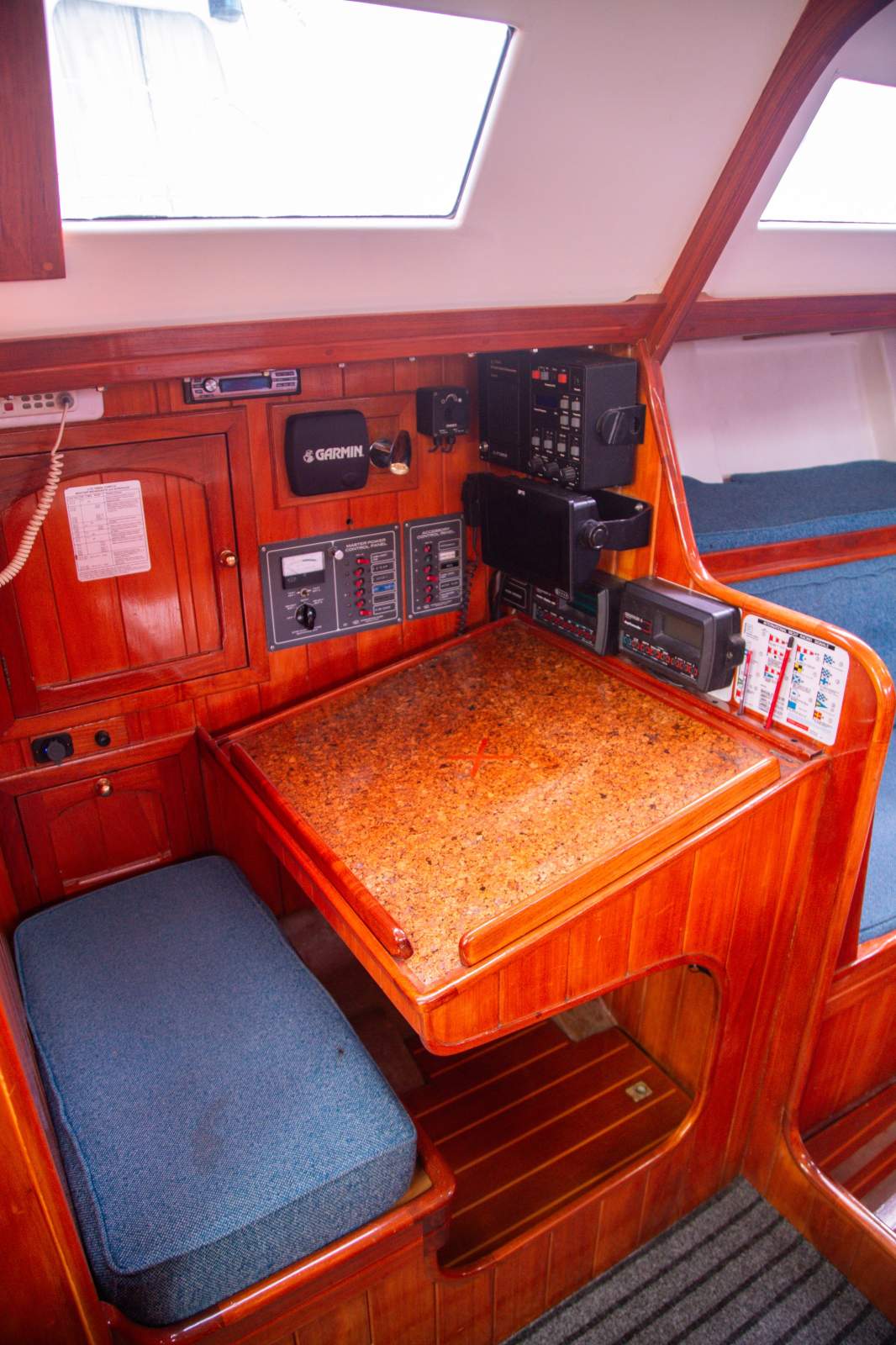 Stepping inside, the interior simply gleams with rich gloss varnished timber beautifully paired with clean white finishes to create and light and welcoming ambience. The generous saloon features a large dinette, with seating for 12 in comfort on the neatly upholstered settees. The accommodation is ideal for anything from comfortable cruising with family and friends, through to the full race crew. Forward is the spacious master suite with a large double v-berth, seating, and full ensuite with toilet and vanity. Aft are two private double cabins, with a second bathroom to port. The saloon provides four single berths when additional accommodation is required. The well appointed U shaped galley is to starboard and features a large top loading fridge and freezer (with a NEW compressor), two burner stove with oven (with NEW gas lines and regulator), stainless steel sink with fresh water, and ample storage space. The package is complete with a traditional chart table with the NEW chart plotter and VHF Radio.