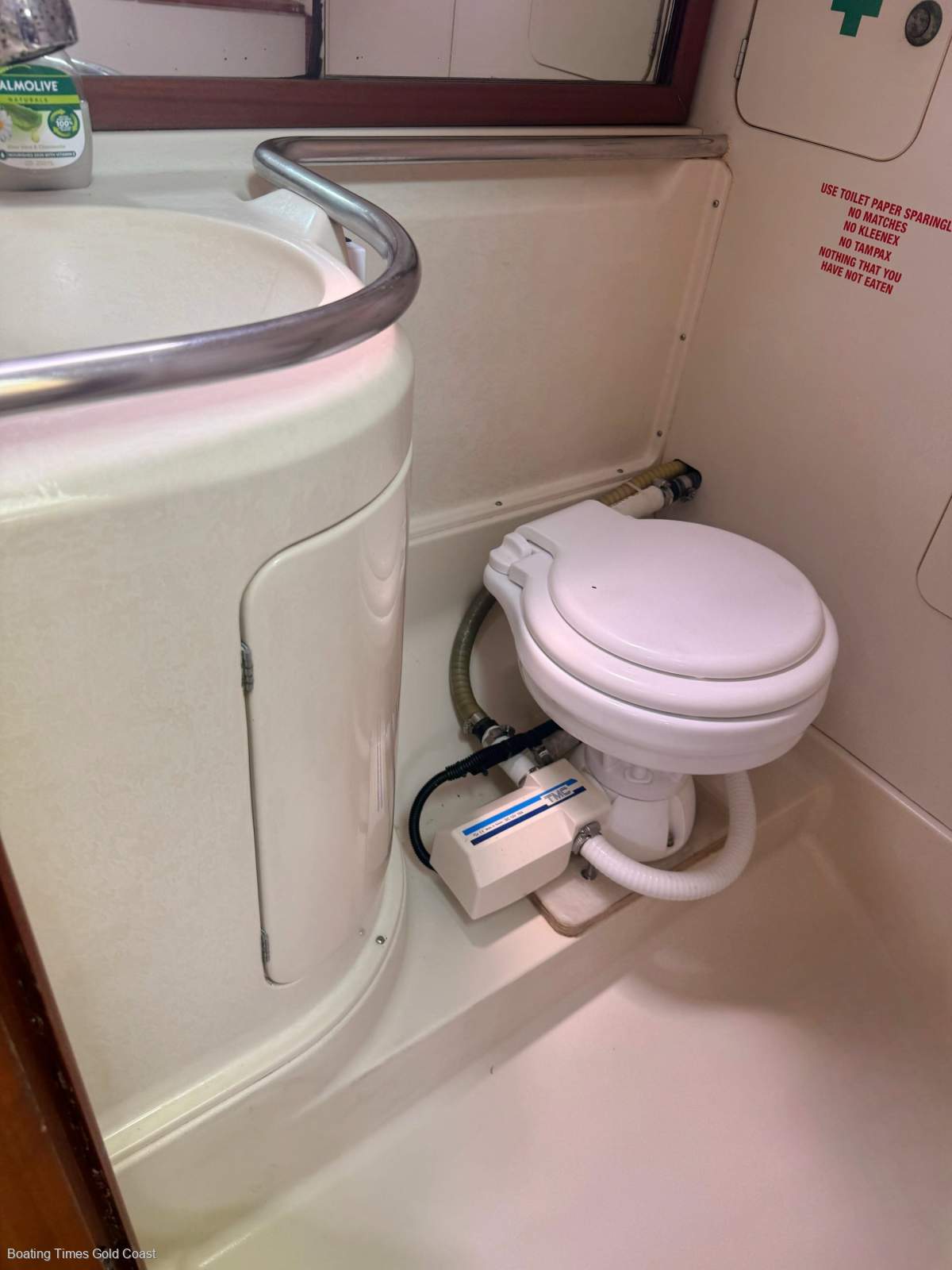 The navigation station is well laid out, and the galley includes everything needed for extended cruising. The head compartment is spacious for a yacht of this size, with quality fittings and a practical layout.