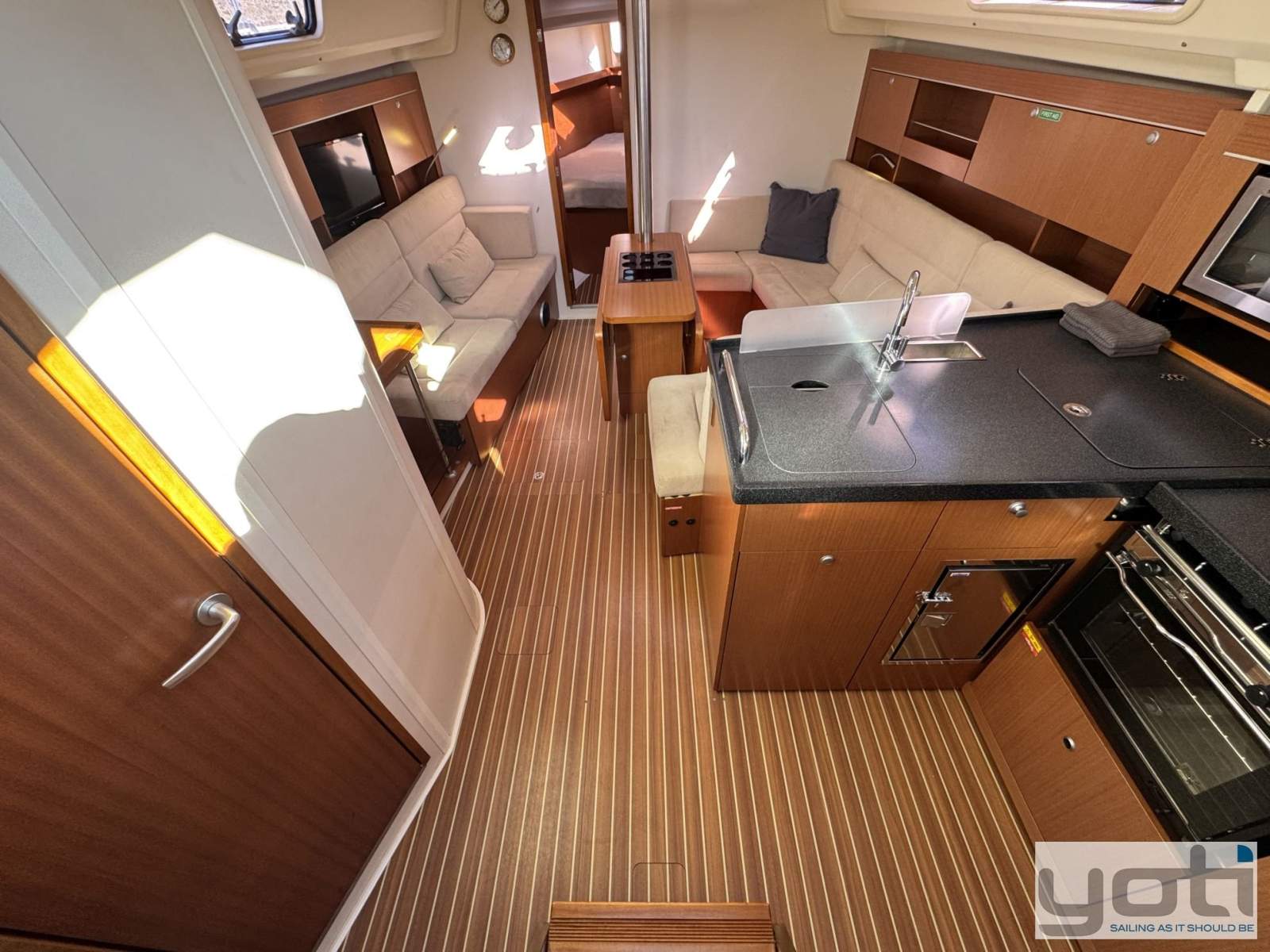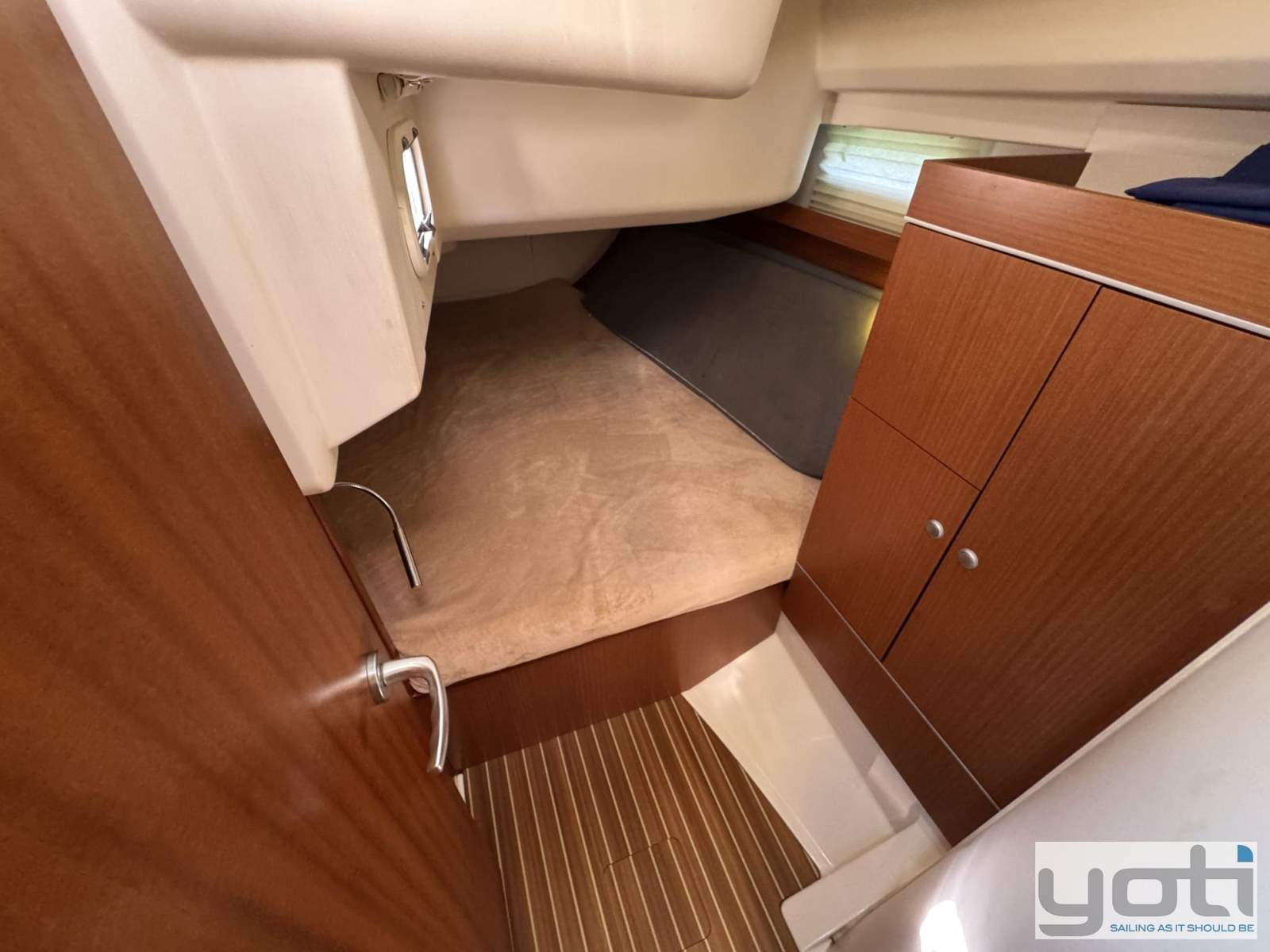 Two cabins. Forward cabin with large double berth, 2 hanging lockers. Large galley area. Saloon with dedicated chart/laptop table aft and bench seating. Large saloon table. Additional double berth. Huge storage area behind galley with shelving that is also accessible from cockpit locker. Double aft cabin to port. Large enclosed head and shower. Upgraded blind set for hatches and side windows intergraded sunshades and fly screens, Courtesy lights in companionway and cockpit. Mahogony style furniture selection, upgraded classic stipes flooring.