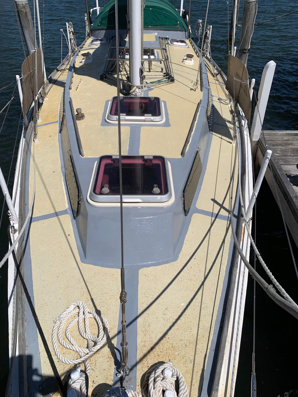 Self furling reacher and genoa on bowsprit. Storm staysail on hanks. Good condition. Brand new main. Spinnaker.