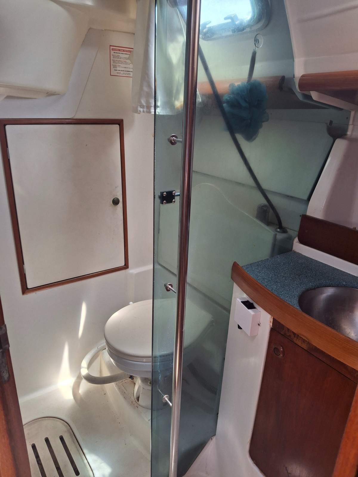 Down below there is a traditional L-shaped galley with twin sinks, a 130 Litre fridge and nearly new Eno 2-burner stove with oven. Opposite is the head which has a shower screen to the shower/toilet cubicle, aft of which is a dry locker. The toilet is electric with a holding tank