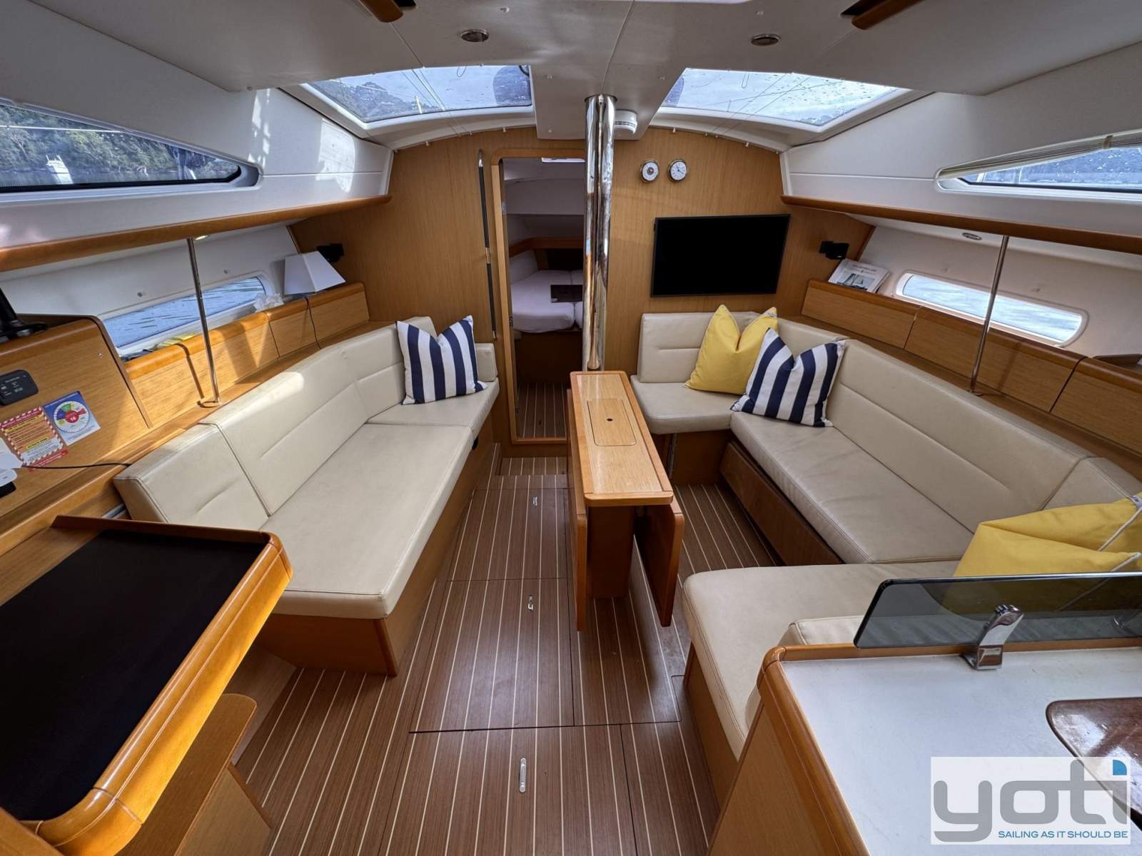 On deck, the cockpit is well protected with a quality dodger and bimini setup, providing excellent shade for summer cruising. A large solar array is mounted atop the bimini, supporting extended time at anchor. The cockpit is a genuinely comfortable and social space, enhanced by custom cockpit cushions throughout and a large varnished cockpit table in excellent condition. Sailing systems are well laid out, with four Harken winches including an electric winch for the in-mast furling mainsail, making sail handling simple and efficient. A bow thruster adds confidence and ease when manoeuvring in tight spaces.