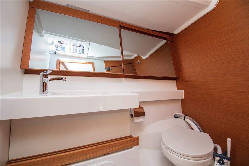 The Sun Odyssey 440 Walk Around is a well-regarded 13-metre cruising yacht from Jeanneau's current production range. The Walk Around deck configuration provides safe, unobstructed passage along both sides of the coachroof, making her practical for short-handed sailing and passage work. Below, the four-cabin, two-heads arrangement is a sensible use of space for a yacht of this length, with Alpi teak joinery and Ambiance Weiss upholstery throughout. The saloon benefits from four opening overhead windows and seven deck hatches, giving good natural light and ventilation below.