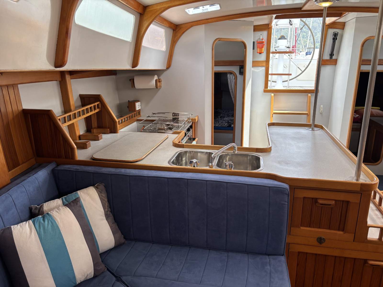 Composite construction of laminated strip planked Western Red Cedar, Epoxy fibreglass inside & out with high aspect Fin keel & Lead bulb bolted to keelson. Double spreader fractional rig with roller furling headsail & all sheets running to helm for short handed easy sailing.