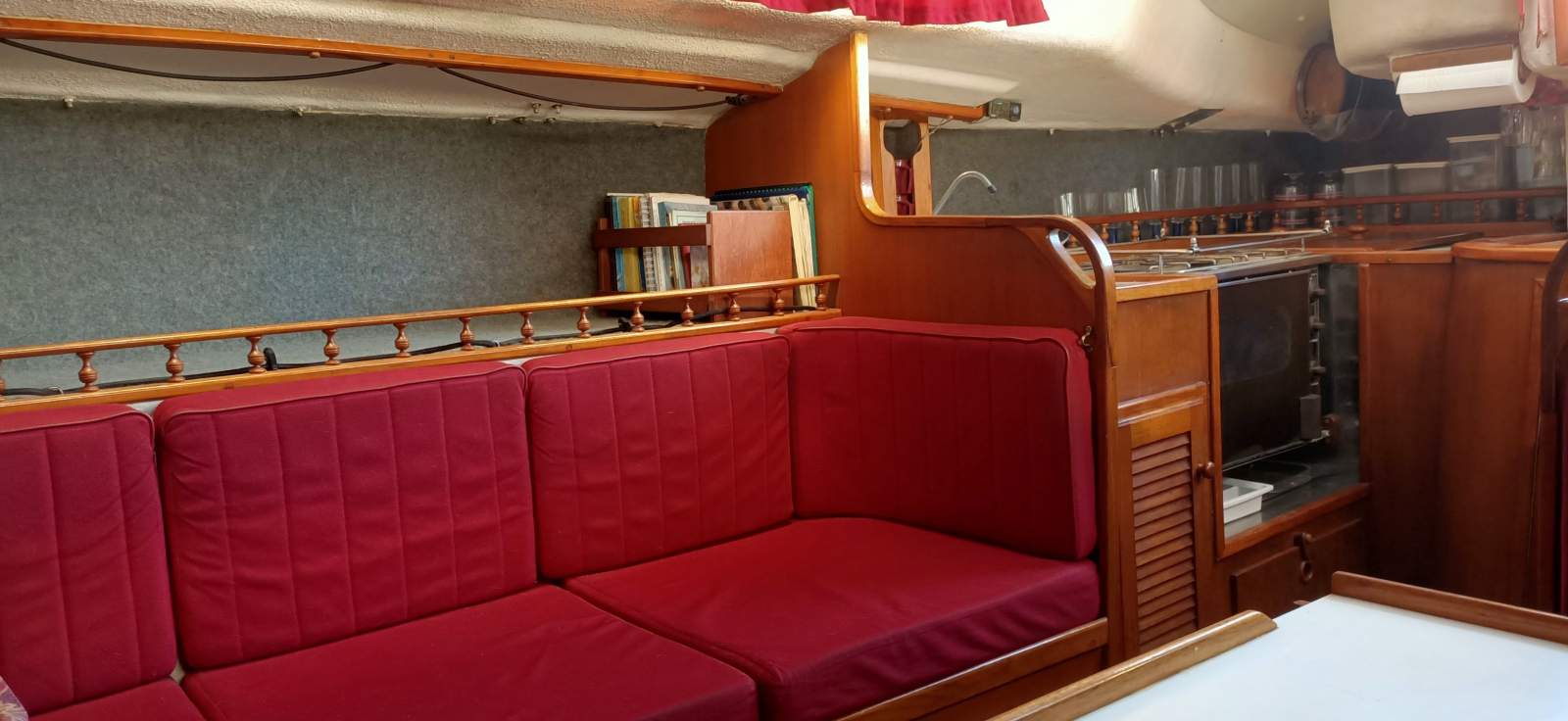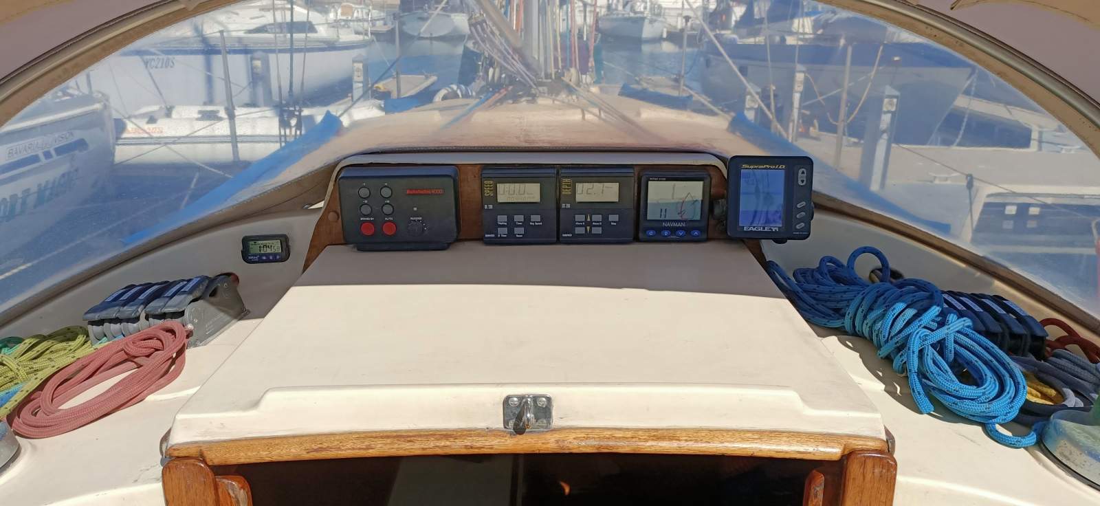 Protective cockpit and deck handrail covers help preserve the laid beech cockpit and external varnish. She presents as a practical, capable and well-equipped cruising yacht, ready for her next owner.