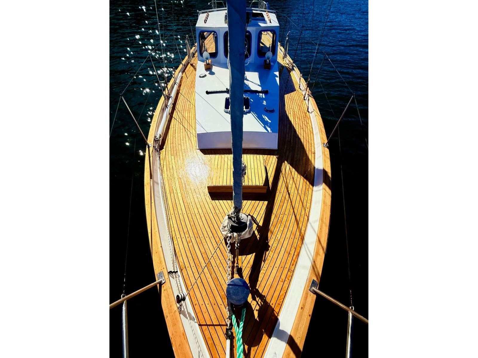 At 39' LOA with a 12'2" beam, 5'10" draft, and a versatile sail plan including main, headsail, staysail, and a sock-launched red-white-blue spinnaker. White Star is easily handled single-handed -- her current owner regularly solos both day sails and multi-day passages. With 1,500 litres of diesel and a Ford Lehman 80hp four-cylinder, she offers an extraordinary range of ~4,500 nautical miles under power -- true long-distance capability.