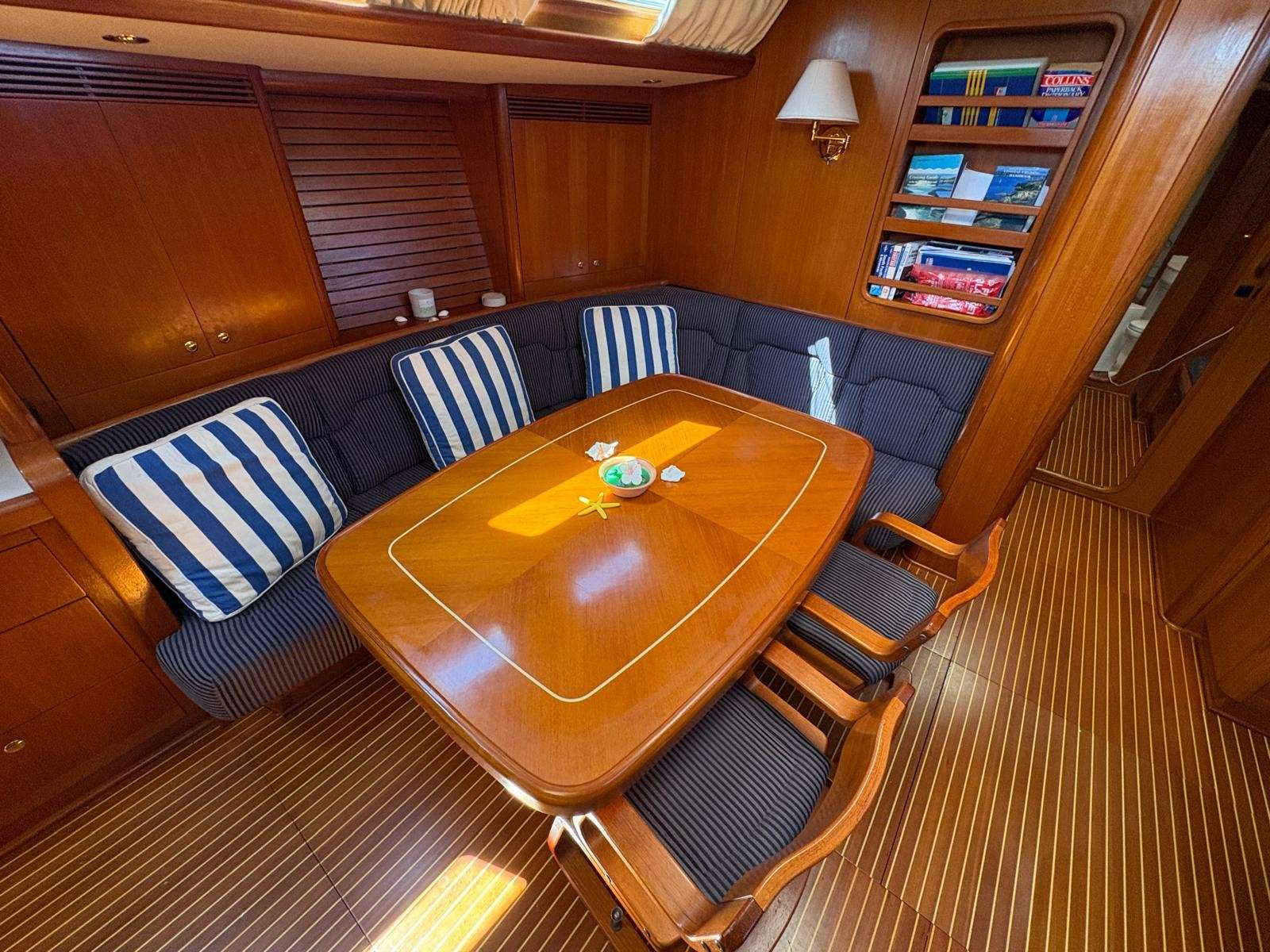 Teak interior with a starboard bunk cabin, portside queen cabin with leeboards installed in 2023, aft master cabin with a large central bed & ensuite. Saloon: Midships with starboard living area and portside large table & galley. The double cabin had lee boards installed in 2023.