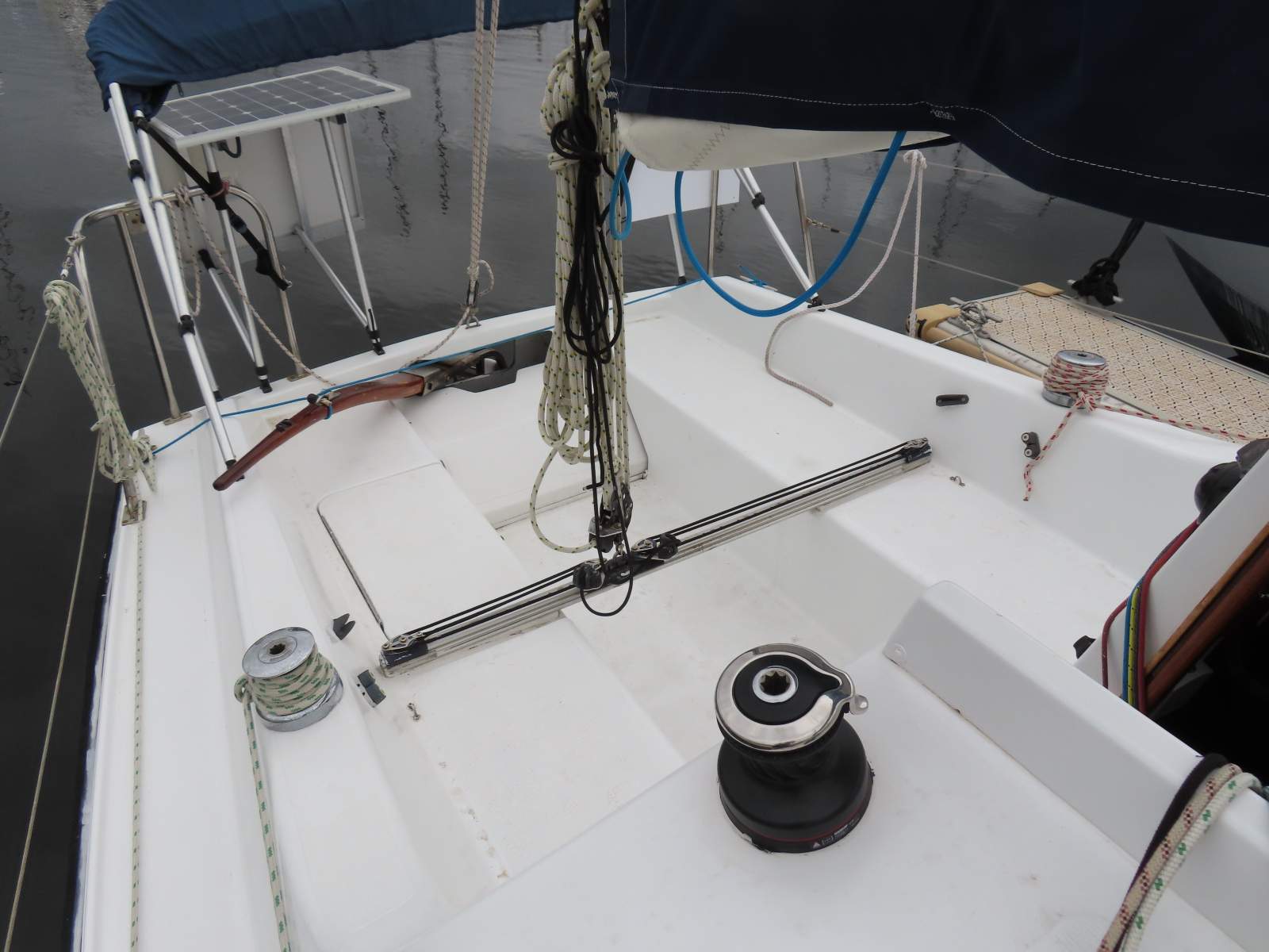 Outside, the spacious cockpit is well set up for easy cruising shorthanded. All of the lines are lead aft to the self tailing Harken cabin top winches, the mainsheet and primary winches are in easy reach of the helm, and the furling headsail is a great addition. This is a yacht which really is ideal for anyone from a novice learning the ropes, through to an experienced sailor wanting to enjoy the thrill of racing. The cockpit is also complete with a fold out bimini providing excellent protection from the sun or rain.