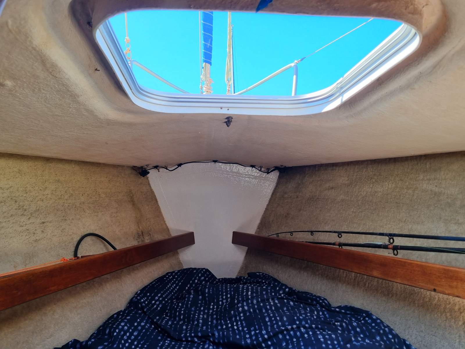 Original gelcoat, new Gebo fwd hatch, new Bomar deck hatch.
