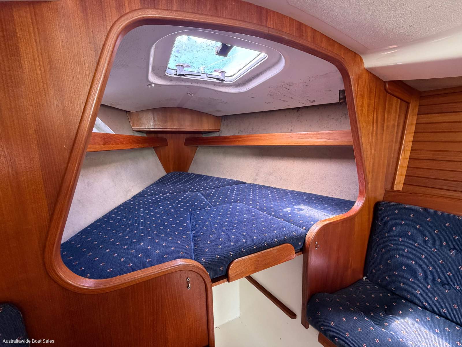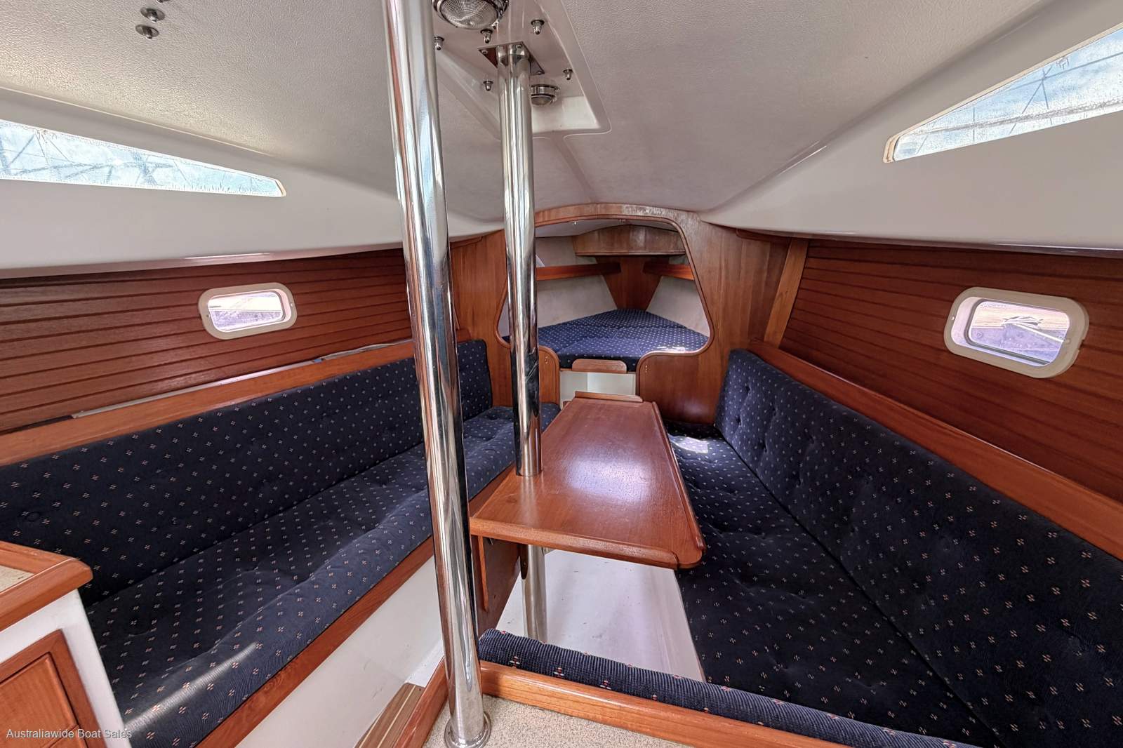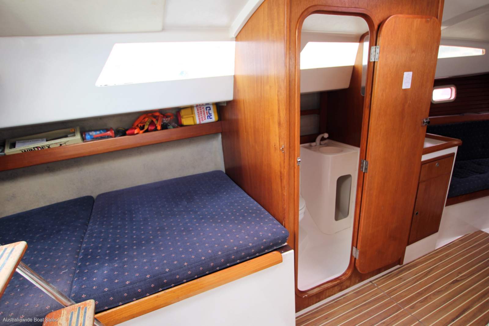Very tidy and nicely laid-out, open plan style interior with good upholstery and joinery. Forward V berth, two single opposing settees (both with sea cloths), timber drop leaf table, enclosed heads with vanity, galley opposite and two quarter berths. Good natural light and ventilation and headroom to midships at 190cm.