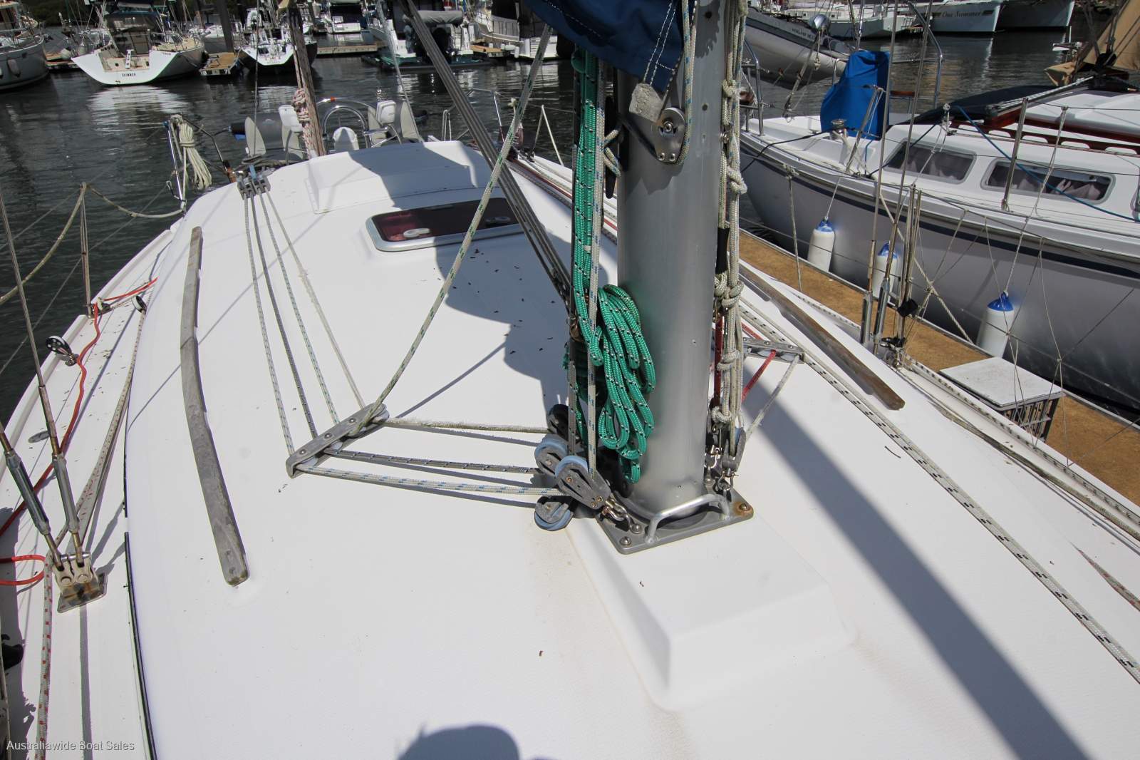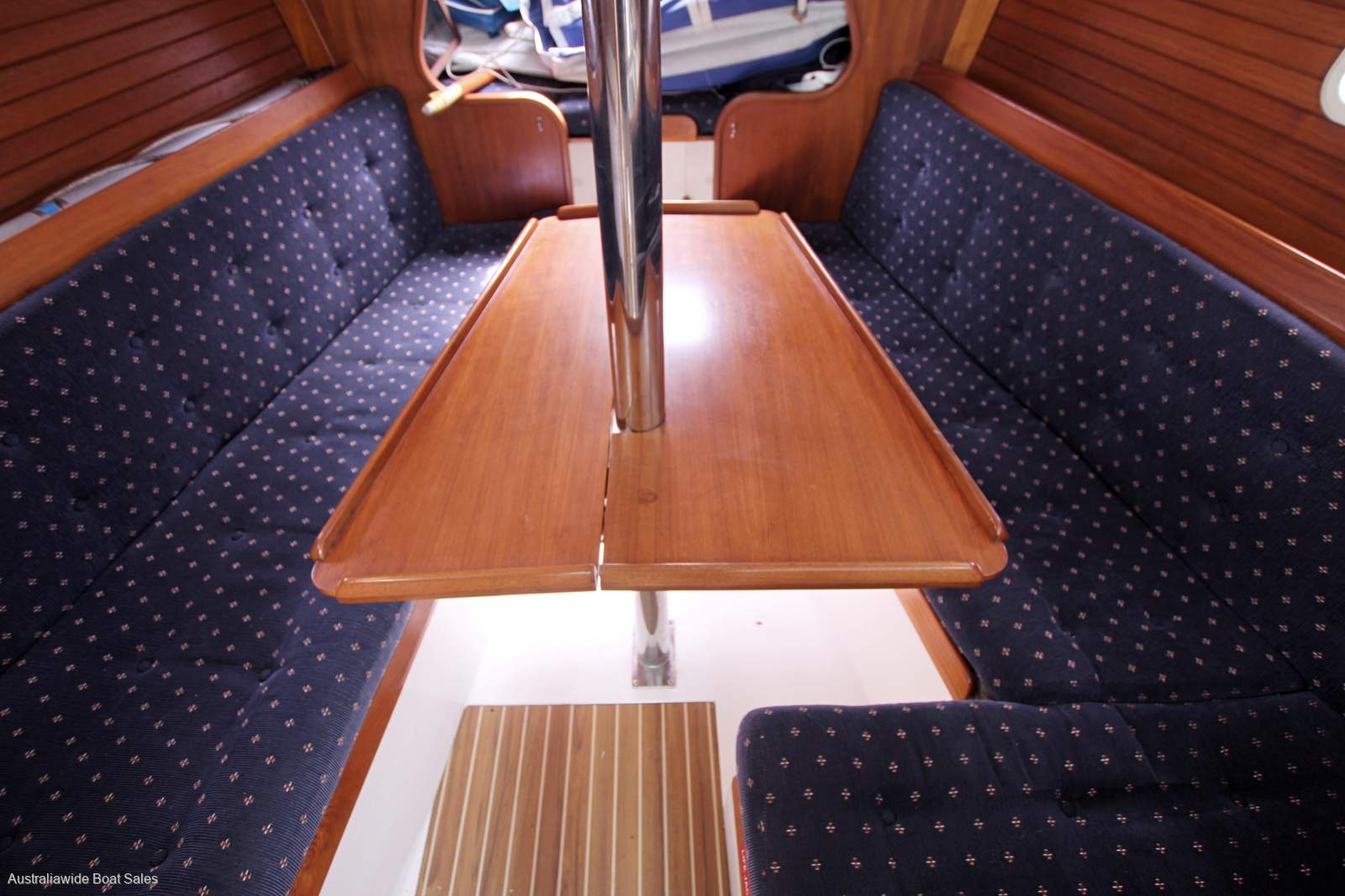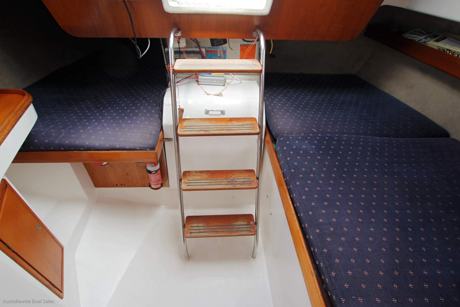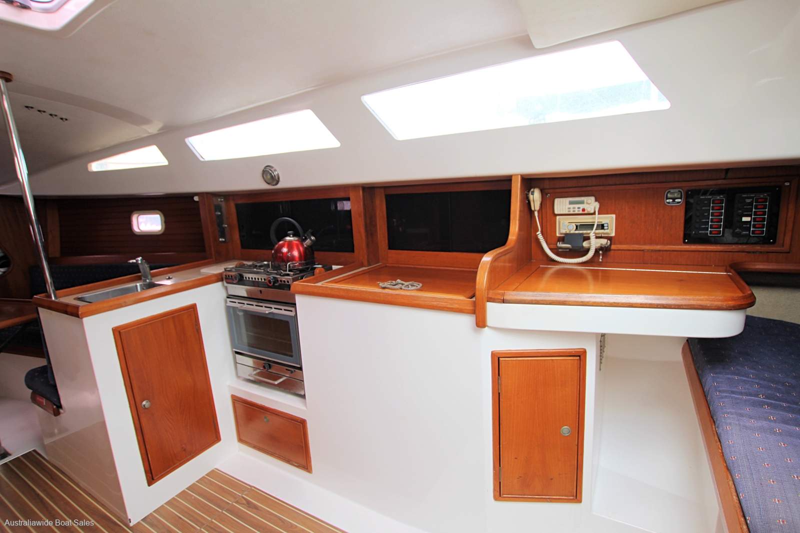 Very tidy and nicely laid-out, open plan style interior with good upholstery and joinery. Forward V berth, two single opposing settees (both with sea cloths), timber drop leaf table, enclosed heads with vanity, galley opposite and two quarter berths. Good natural light and ventilation and headroom to midships at 190cm.