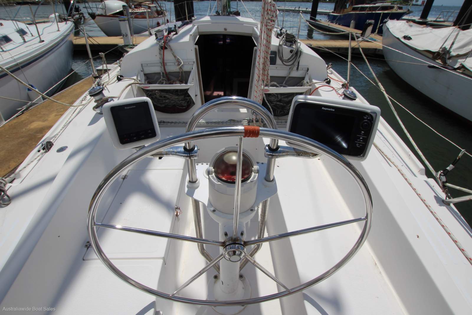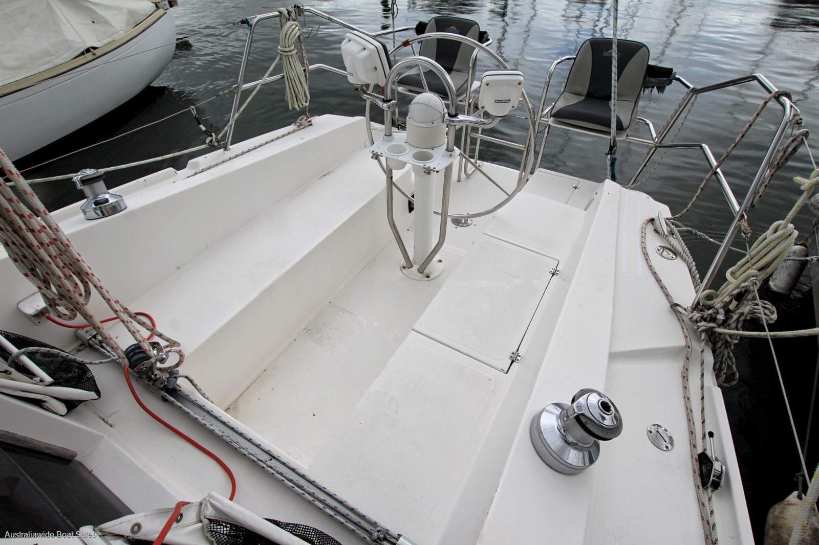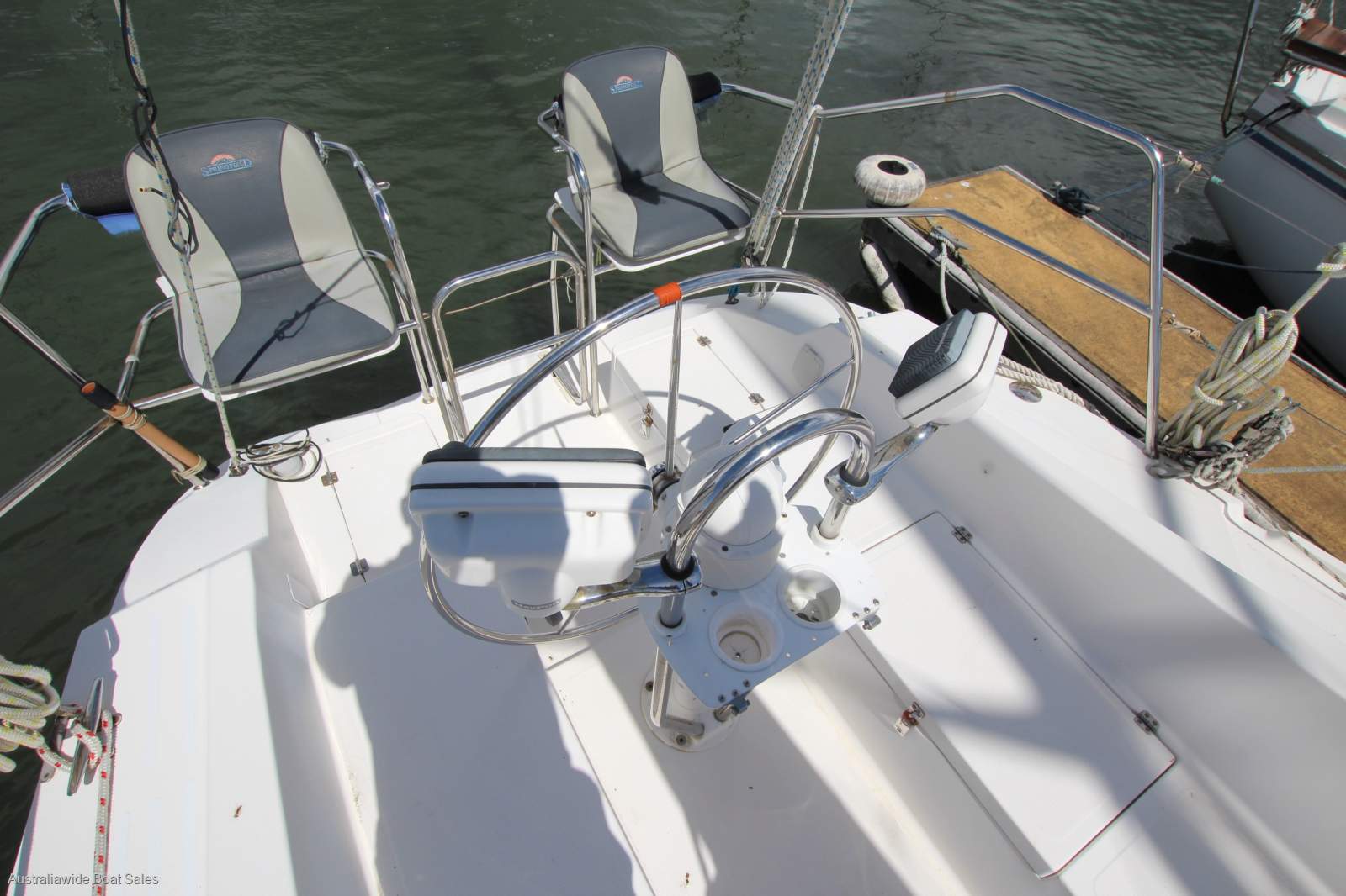 Stainless steel wheel helm, Lewmar self tailing sheet and halyard winches, walk-through transom, with swim ladder, cockpit lockers, cockpit cushions, twin transom seats, timber grab rails, prodder, spinnaker pole, fenders and mooring lines.