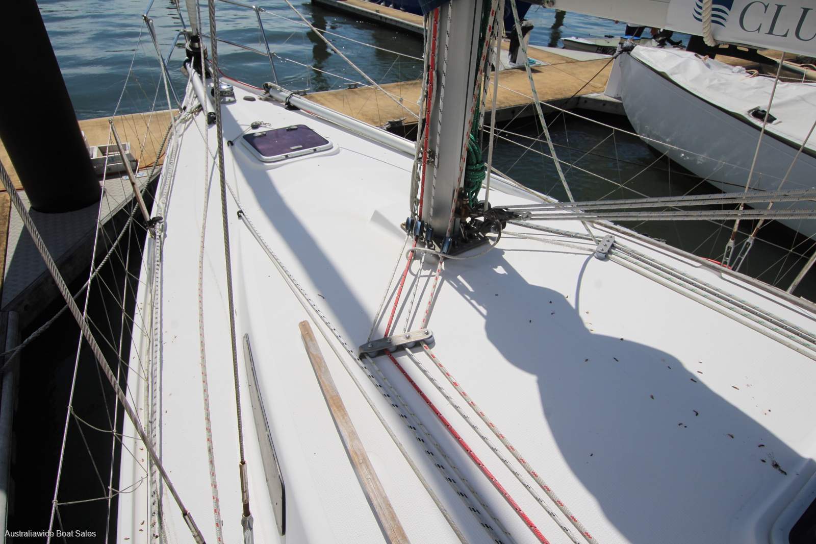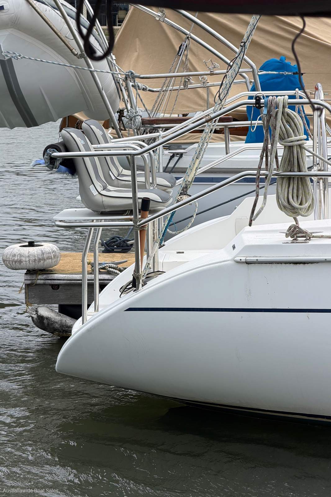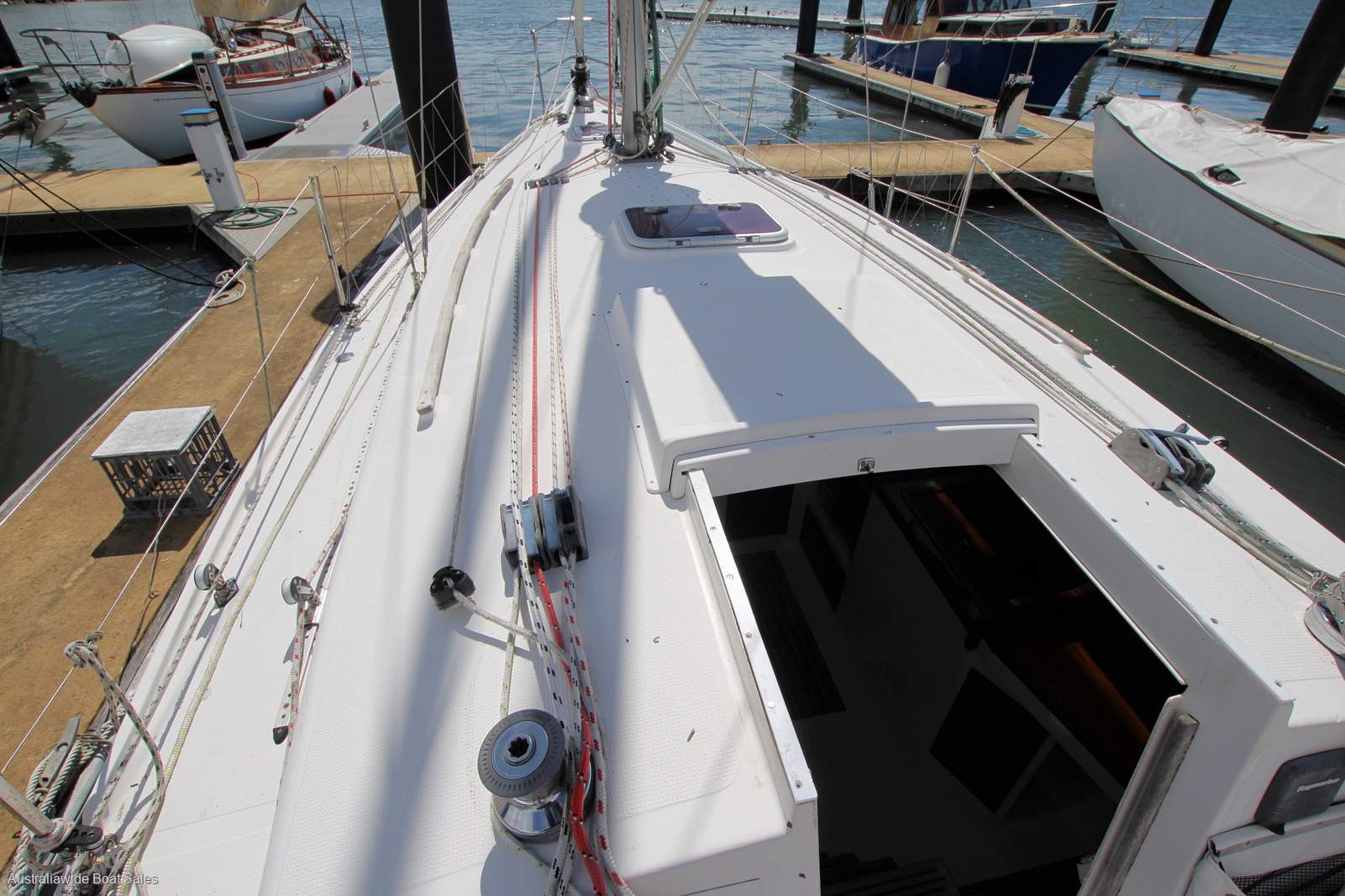 Stainless steel wheel helm, Lewmar self tailing sheet and halyard winches, walk-through transom, with swim ladder, cockpit lockers, cockpit cushions, twin transom seats, timber grab rails, prodder, spinnaker pole, fenders and mooring lines.