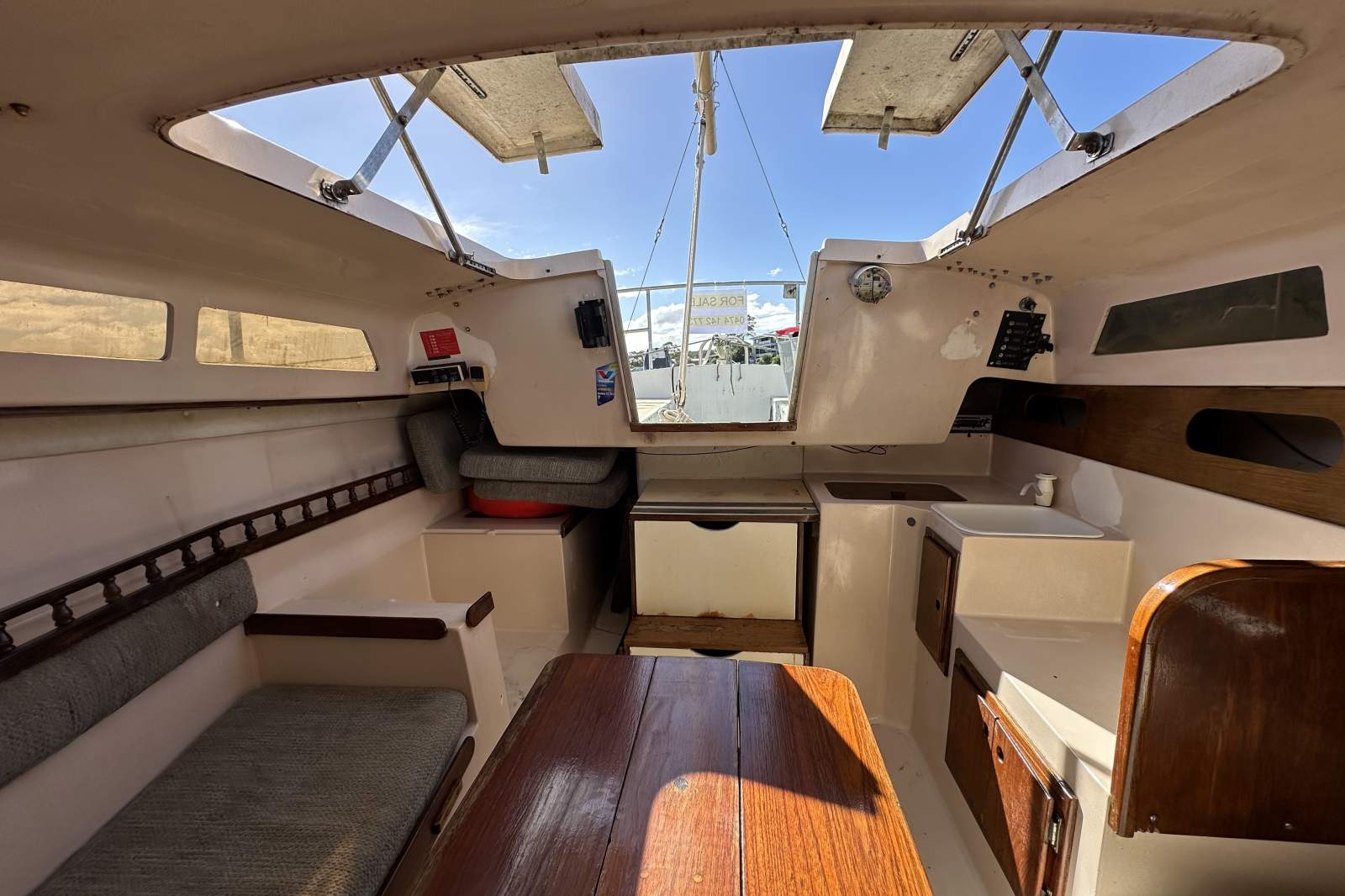 Large cockpit and comfortable accommodation below including galley, folding centre table and room for head. Pop-top ceiling over galley, V-berth, quarter berth, three settees, loads of storage, stove area, moulded sink, excellent and most effective ice chest and internal lighting.